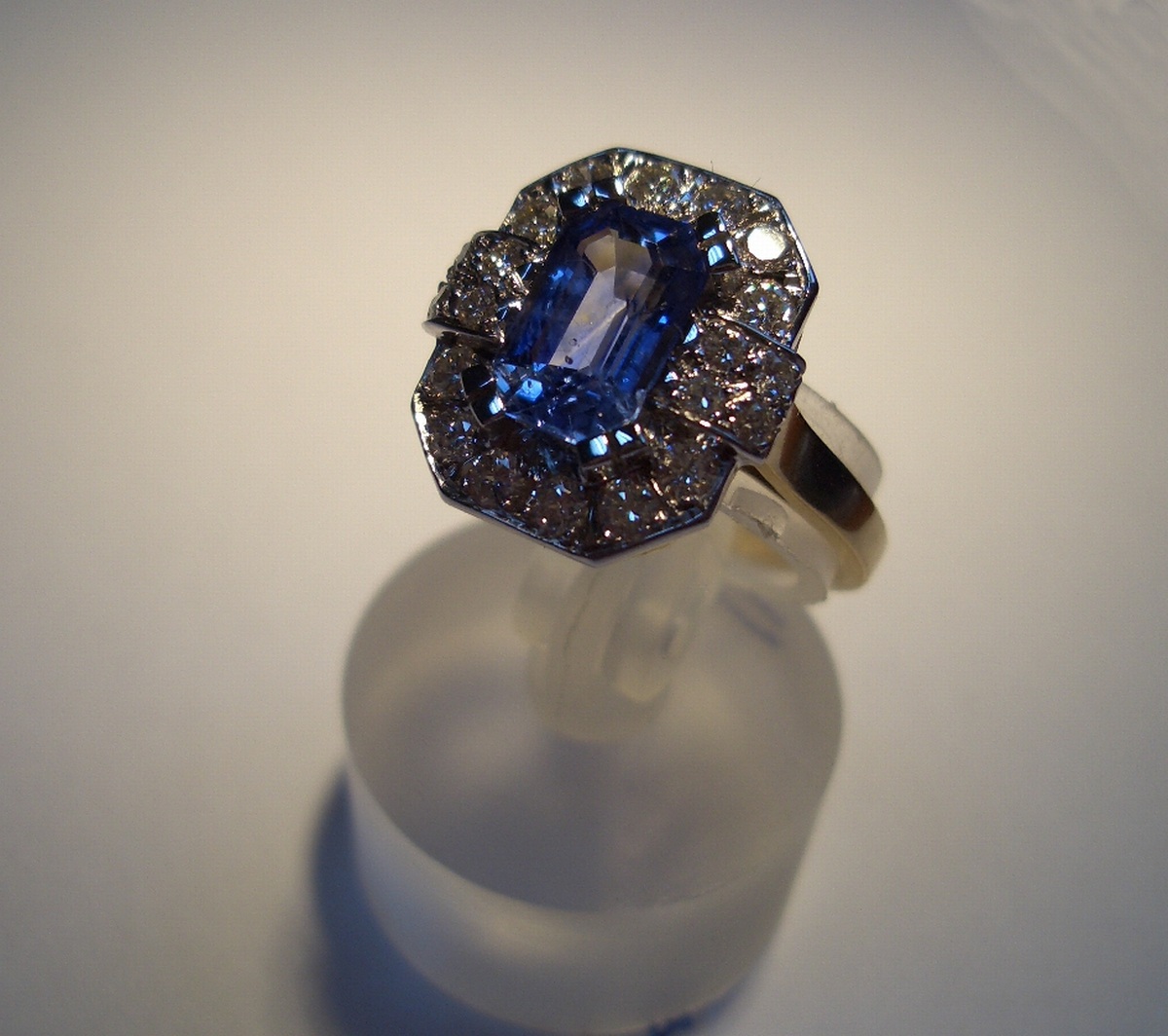 BAGUE adoptant la forme d'un rectangle à pans coupés deux ors ornée d'un saphir taille émeraude de 2,10 carats environ agrémenté de 20 diamants blancs taille moderne de 0.65 carats environ. Poids brut : 6,85 g.