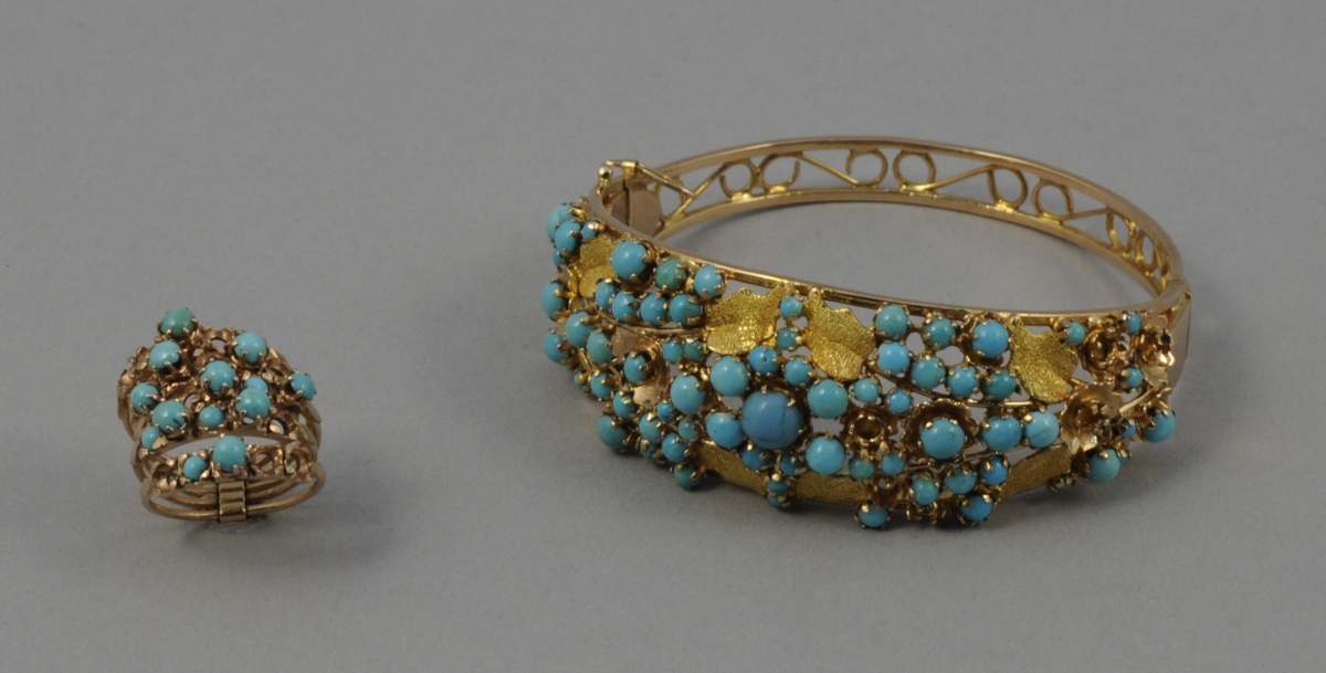BRACELET et BAGUE en or jaune, décorés de feuilles et sertis de turquoises et pierres de synthèse cabochons. Poids brut : 34 g.