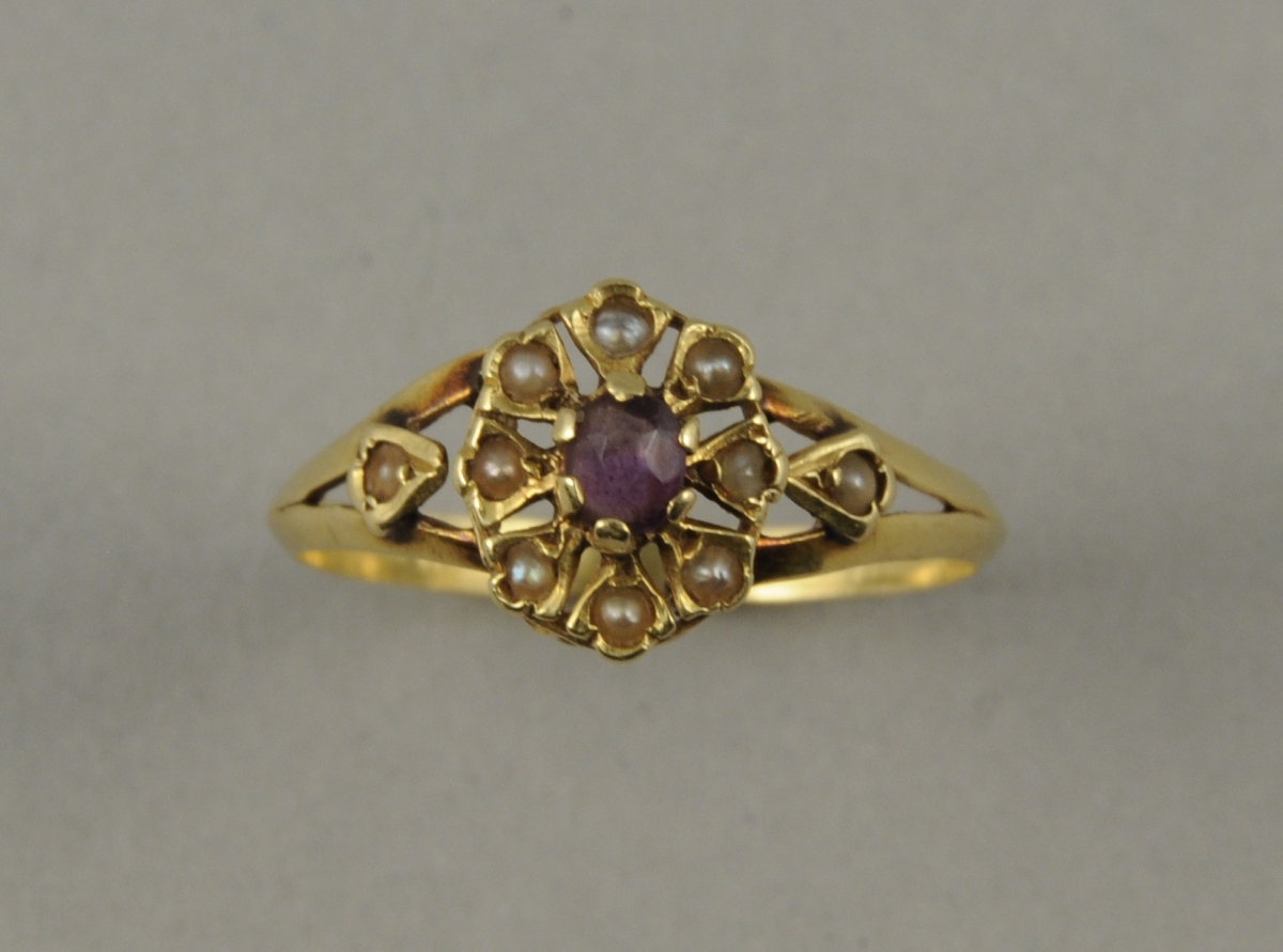 BAGUE en or jaune sertie d'une améthyste facettée de forme ovale cerclée de huit petites perles. Deux autres perles aux épaulements. Le chaton ciselé d'ogives ajourées. Fin XIXème - début du XXème. Poids brut : 1,3 g.