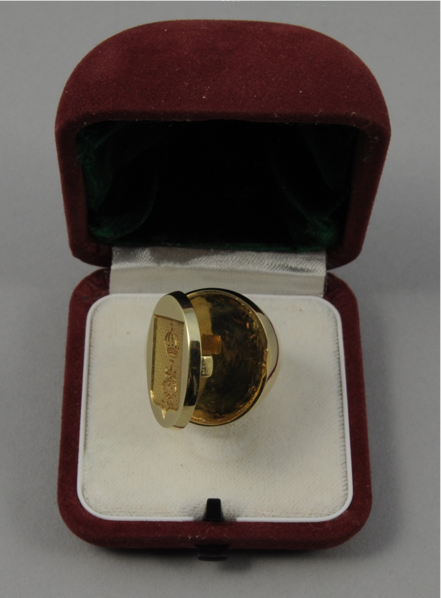 BAGUE RELIQUAIRE en or, le chaton pivotant gravé d'un blason aux symboles Templiers (Croix, Couronne d'épines et Clous) sous une couronne fermée. L'intérieur de l'anneau marqué "1314 - 28.09.1978. J". Poids brut : 33 g.