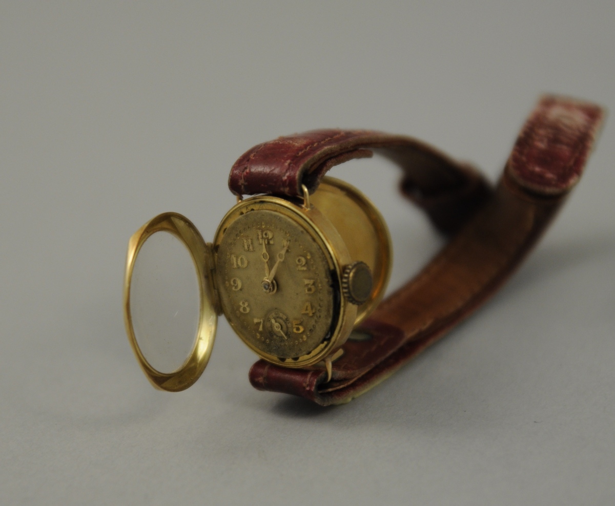 -Une montre-bracelet de dame en or. Double cadran indiquant les heures et les secondes en chiffres arabes. Tour de poignet en cuir. Poids brut : 12,5 g.