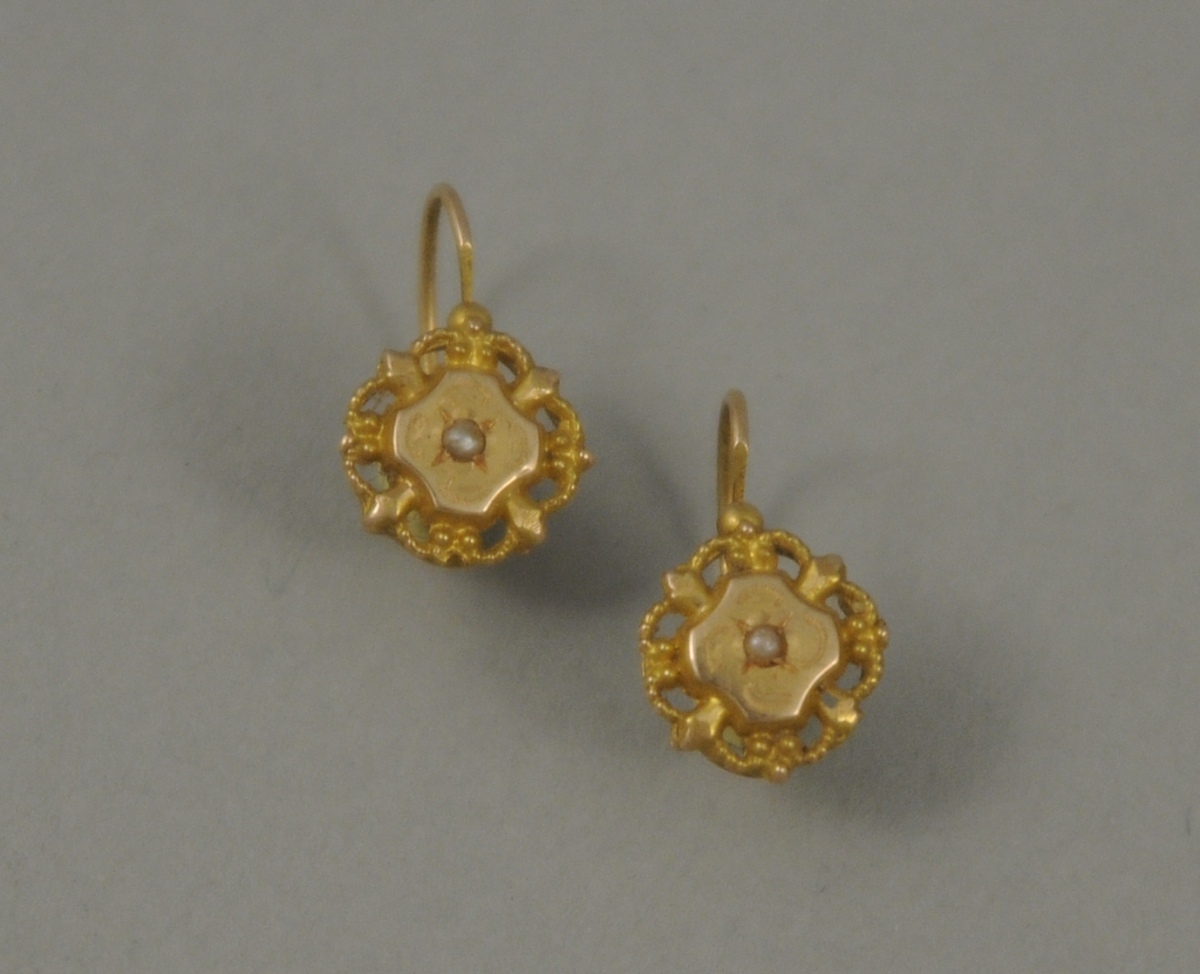 -Une paire de boucles d'oreille en or jaune sertie au centre d'une demi-perle. Décor géométrique ajouré. Poids brut : 0,8 g.