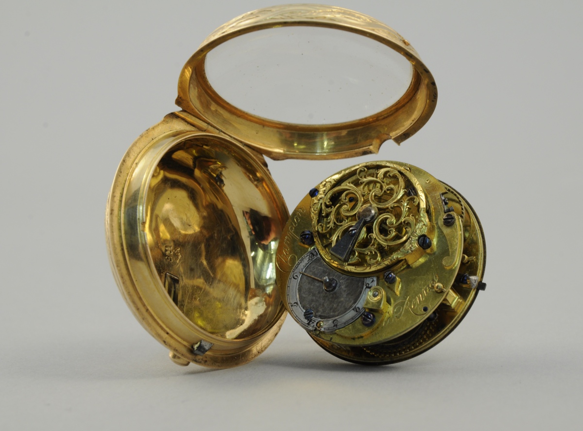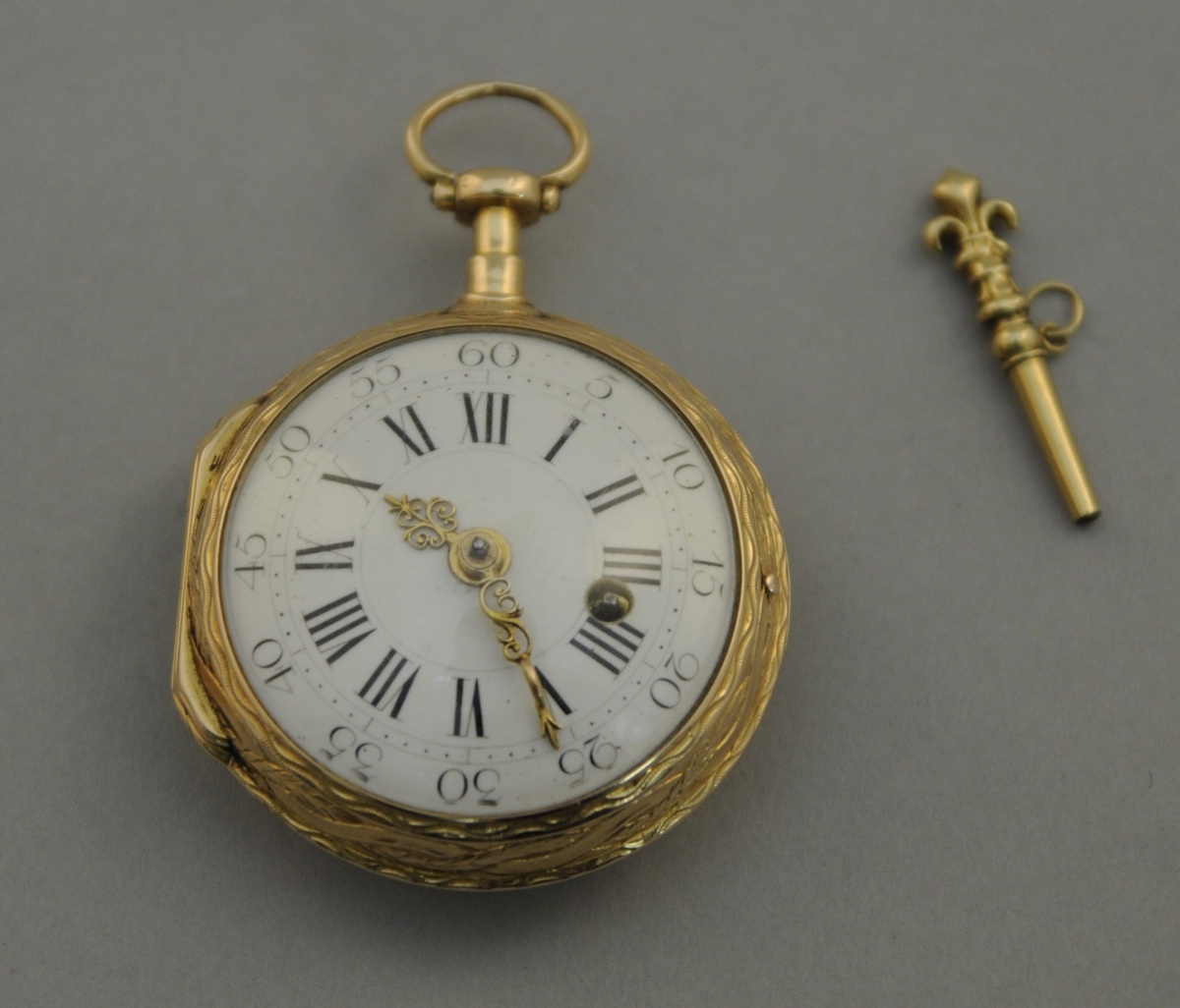 MONTRE OIGNON, boîtier en or à décor rayonnant d'un trophée aux attributs de la musique et d'une frise de feuillages entrelacés en or. Cadran émaillé blanc indiquant les heures et minutes en chiffres romains et arabes. Les aiguilles à décor ajouré de volutes. Fusée à chaîne et échappement à foliot. Piliers en balustres à pans. Coq finement ajouré de volutes à feuilles. Clef or figurant une fleur de lys.