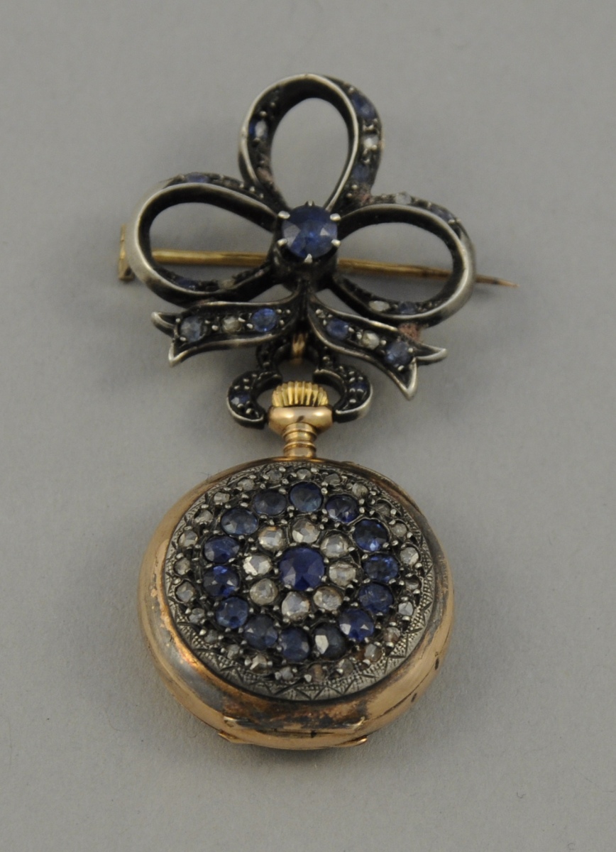 MONTRE de COL à remontoir au pendant en or rose. Le cadran émaillé blanc indiquant les heures en chiffres arabes. Le dos du boîtier pavé de façon circulaire de strass blancs et bleus. Diam. 2,4 cm. Elle est assortie de sa broche adoptant la forme d'un ruban noué en argent serti de même. Épingle en or. Poids brut. 18,7 g.
