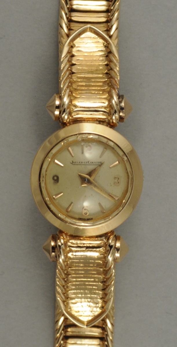 MONTRE-BRACELET de dame en or, mouvement rond signé JAEGER LE COULTRE n°140003 ; bracelet ruban torsadé, avec écusson.