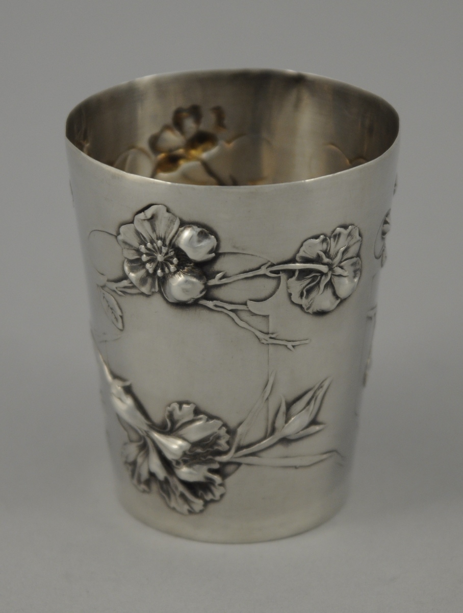 TIMBALE droite à décor repoussé de branchages fleuris naturalistes. Poinçon Minerve. Début du XXème. Haut. 8,3, Diam. 6,8 cm. Poids : 90 g.