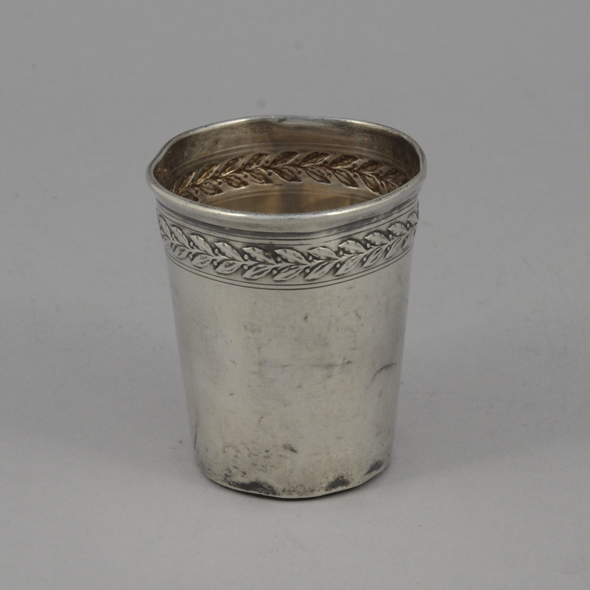 TIMBALE de collégien en argent, ornée d'une frise de feuilles de chêne en guirlande. Poinçon Minerve.