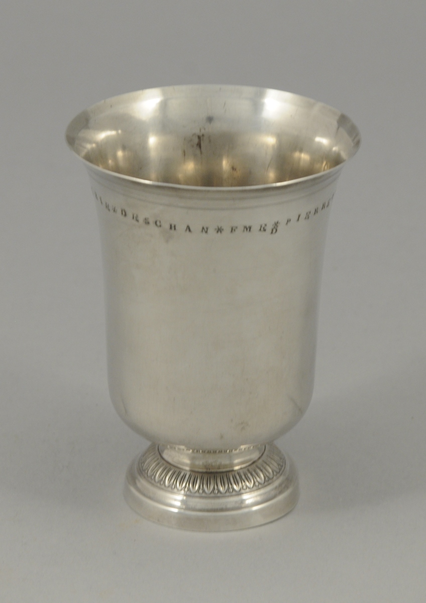 TIMBALE TULIPE en argent, le corps surligné deux fois et gravé *MARIE*DESCHAN* FMED* PIERRE*CERE*, le piédouche à frise de feuilles d'eau. Poinçon Vieillard. Maître orfèvre partiellement effacé : "? R S". Haut. 10,4 cm. Poids : 60 g.