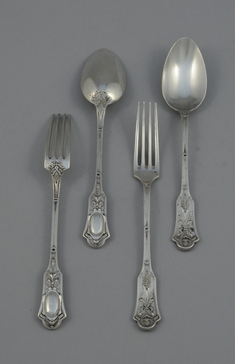 DEUX COUVERTS en argent, probablement de mariage. Beau décor de gerbes de blé nouées à une pomme de pin et feuilles d'acanthe, flambeau, branches de chêne, cartouche cerclé de rais de perle, volutes et filets. Poinçon Minerve. Fin du XIXème. Long. 18,6 cm. Poids : 205 g.