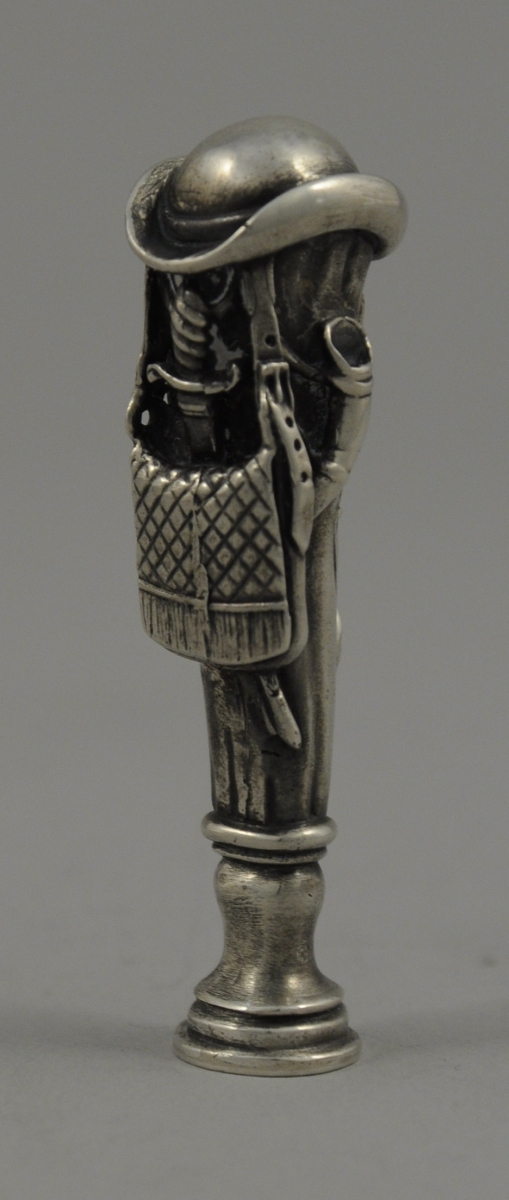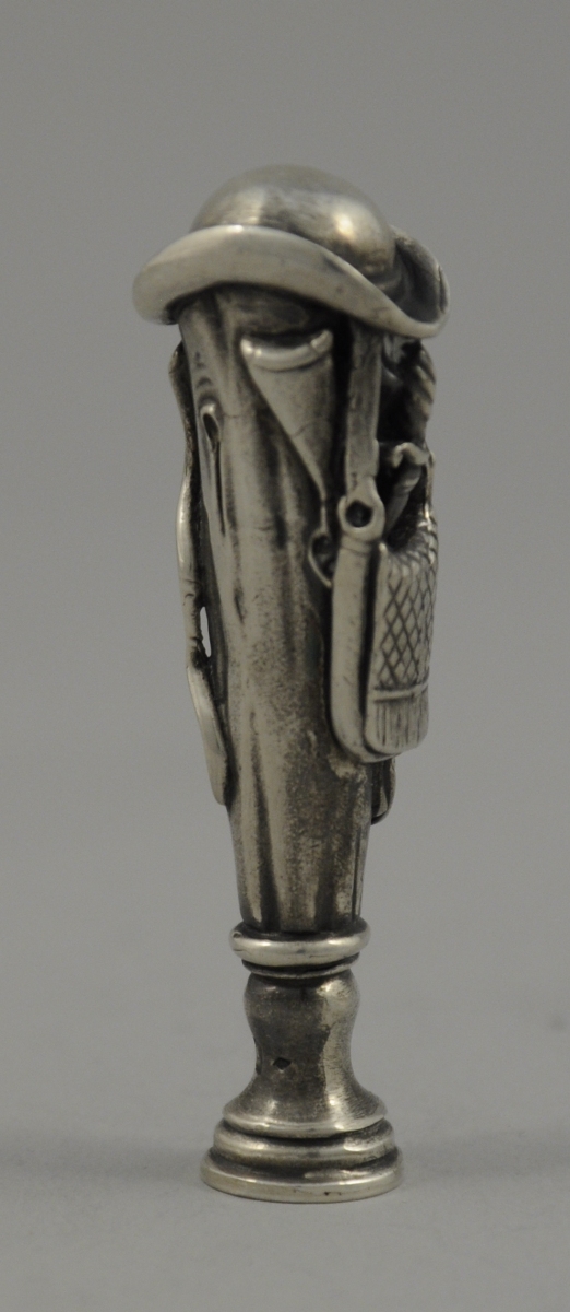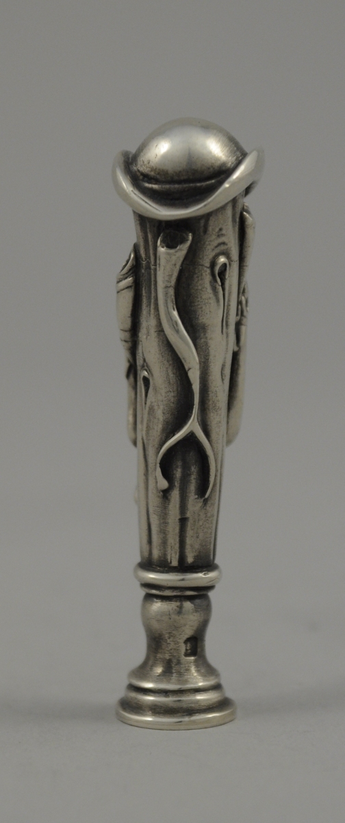 SCEAU en argent orné d'attributs de chasse tels que gibecière, corne, chapeau, fusil et dague. Poinçon Minerve. Haut. 7,7 cm. Poids. 115 g.