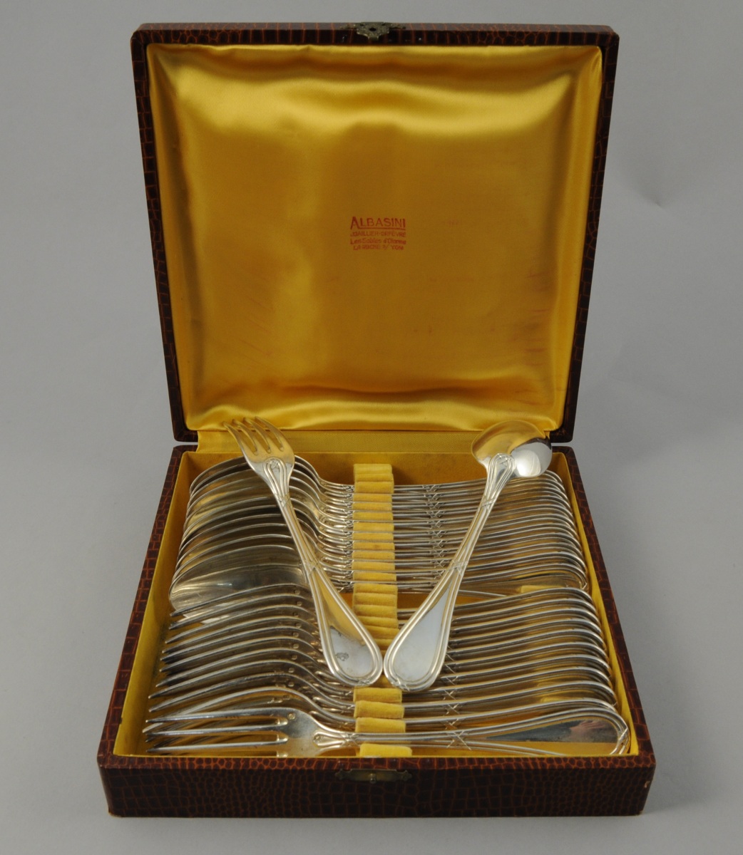 Douze grands COUVERTS en argent, modèle filet ruban. Orfèvre Puiforcat, Poinçon Minerve. Poids : 2.440 g.