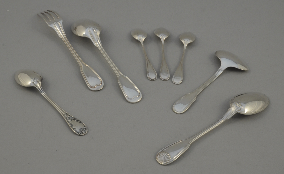 1 COUVERT à entremets en métal argenté. ERCUIS. 1 CUILLÈRE à bouillie. 1 CUILLÈRE à café. 3 CUILLÈRES à moka en métal argenté.