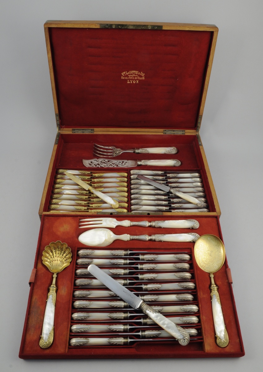 SERVICE en vermeil, argent et nacre, comprenant 60 pièces : 18 couteaux de table, un couvert à salade, une pelle à glace, une cuillère à sucre, 18 couteaux à fromage, 18 couteaux à fruits, un couvert de service à poisson. Viroles et culots à décor de feuillages. Cuillère à glace ornée d'un oiseau dans des feuillages.