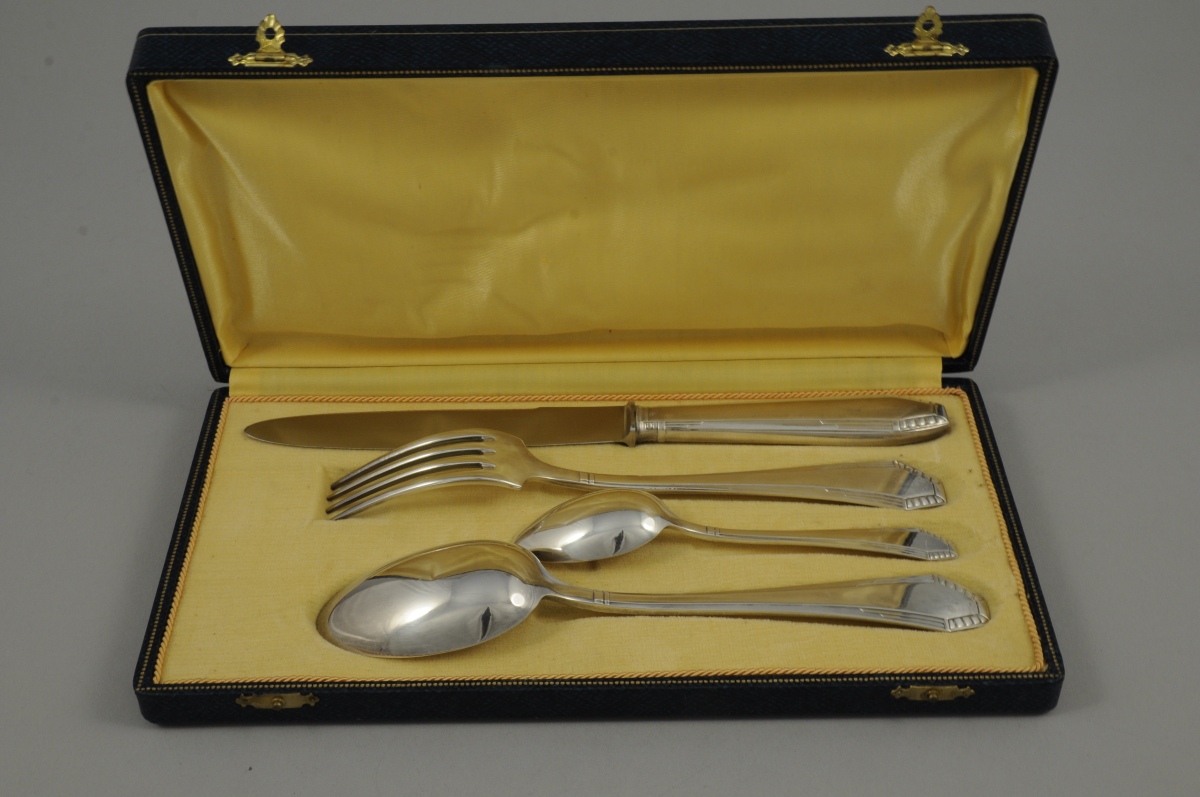 Un COUVERT de table en métal argenté, avec un couteau et une cuillère à café. Art Déco. Dans son écrin.