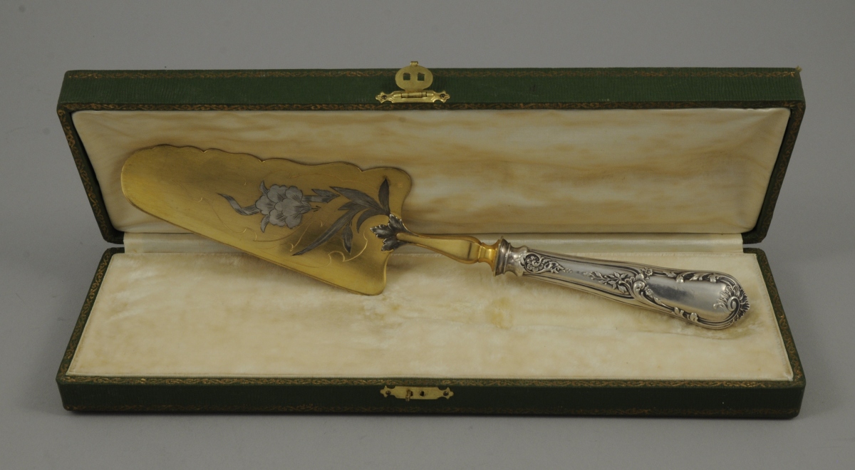 PELLE à gateau. Manche en argent fourré, à décor de rinceaux et feuillages. Spatule dorée, ciselée d'une fleur. Poinçon Minerve. Long. 29,5 cm. Poids brut : 120 g. Écrin.