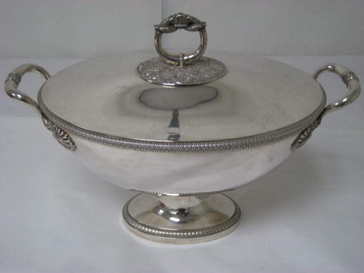 POT À OILLE en argent reposant sur un piedouche de forme ovale orné d'une frise de feuilles d'eau. Le corps uni avec deux anses à attaches palmettes. Bordures du corps et du couvercle ornées de feuilles. La prise constituée de deux cols de cygne formant un anneau reposant sur une terrasse ovale ciselée de feuilles d'eau, palmettes et fleurs sur fond amati. Maître-Orfèvre Gabriel-Jacques-André BOMPART. Poinçon Michel-Ange, Paris 1819-1838. Poids : 2 000 g.