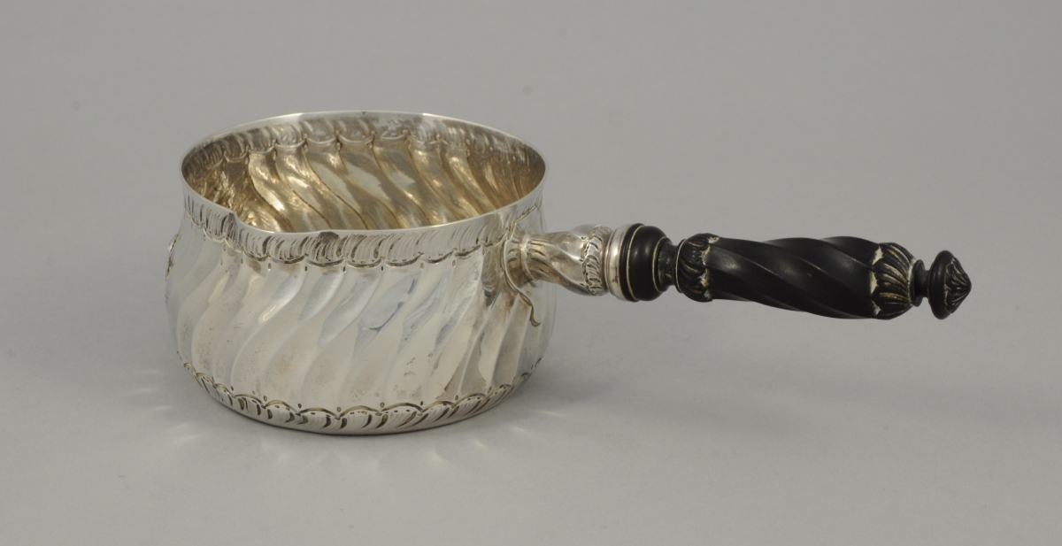 CASSEROLE à SAUCE en argent. Décor au repoussé et ciselé de côtes torses, d'une coquille et de feuilles. Manche en ébène torsadé et sculpté de feuillages.