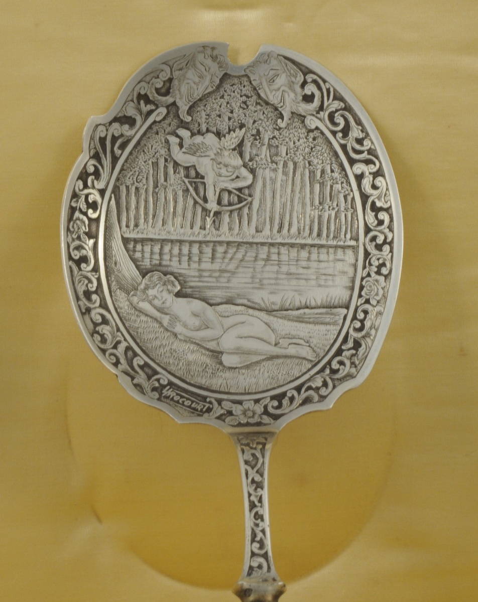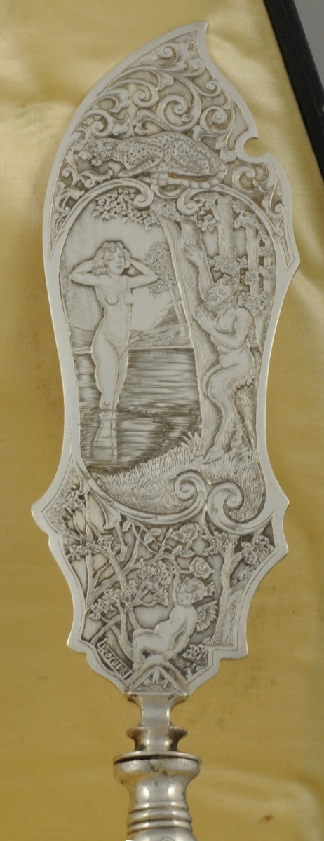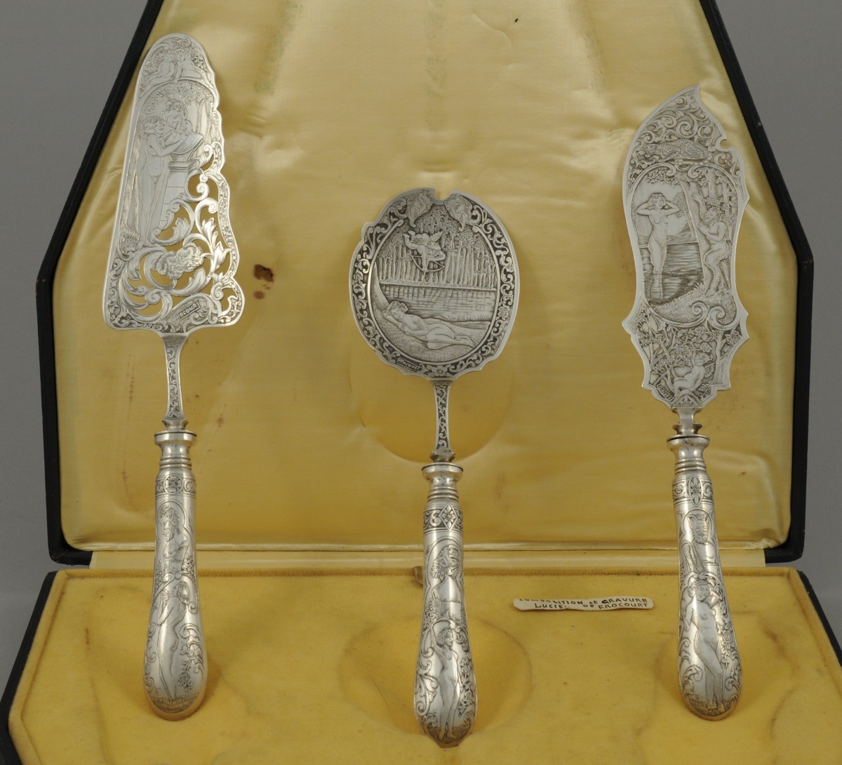Lucien FROCOURT. Projets d'orfèvrerie en métal gravé et patiné. Coffret comprenant un couvert à glace et une pelle à tarte recevant un riche décor. Les manches ornés d'un buste en hermès de faune et d'une femme dénudée Le cuilleron de la cuiller à glace représente Cupidon s'apprêtant à décocher une flêche sur une nymphe endormie près d'un lac en forêt. Les bords ornés d'une frise de volutes feuillagées et de deux masques de faunes. Le couteau à glace présente une femme se baignant observée par un satyre caché derrière un arbre. Le décor de volutes feuillagées dissimule une panthère dans la partie supérieure et un amour s'accrochant à une branche de roses dans la partie inférieure. La pelle à tarte qui reçoit des entrelacs de volutes, agrafes et masque de satyre en partie ajourés, est ornée d'une femme dénudée enlassant le buste d'un faune sous le regard de deux amours. Signés. Début du XXème. Long. 24,6, 27,6 et 29,5 cm.