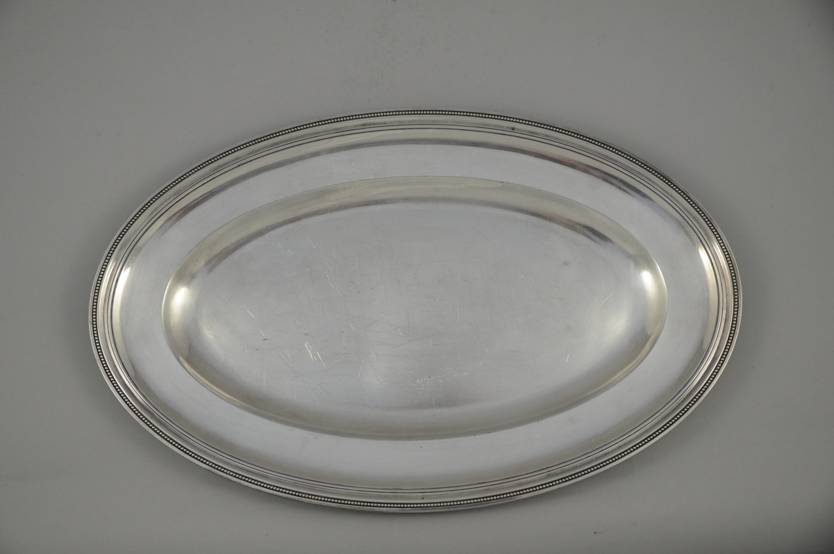 JOINT : PLAT ovale à bords évasés en métal argenté. Long. 34 cm.