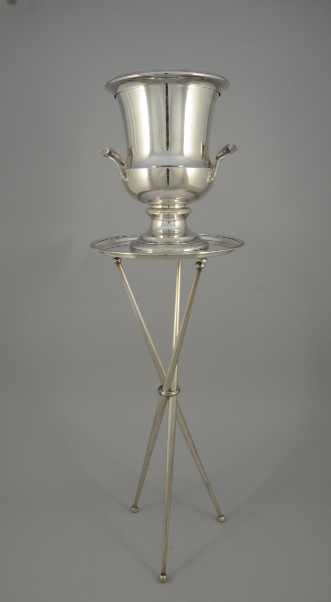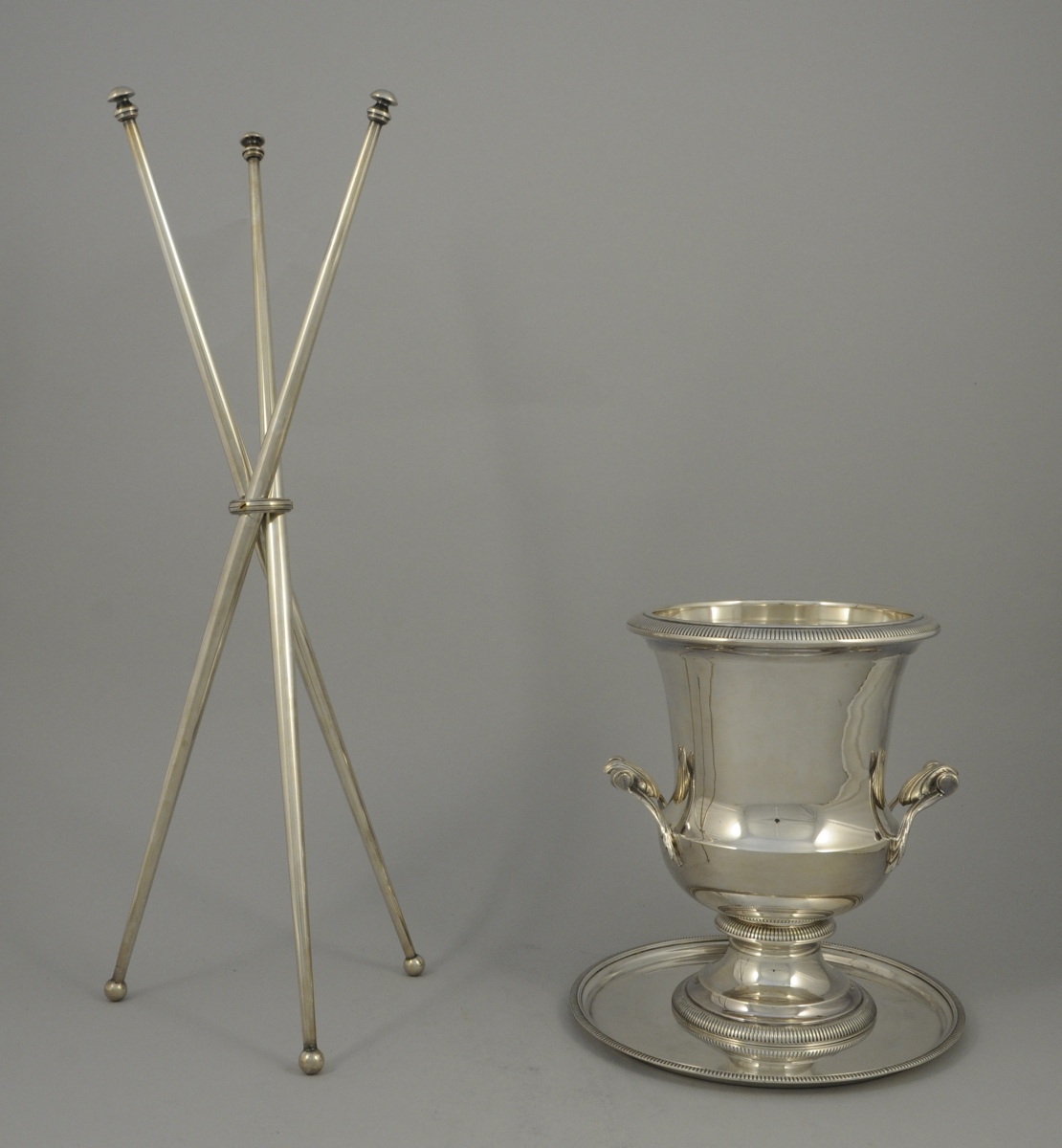 Ensemble en métal argenté, comprenant un SEAU à CHAMPAGNE et une paire de BOUTS-DE-TABLE à trois feux. Le seau en forme de vase Médicis, avec anses ornées de coquilles. Piédouches et bobèches godronnés. Le vase avec un support trépied pliant et un petit plateau.
