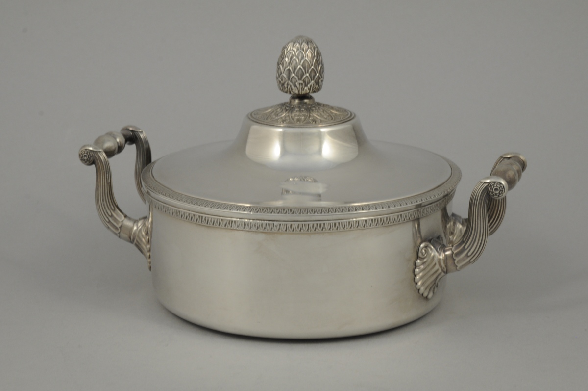 Un LÉGUMIER en métal argenté, de forme circulaire, avec couvercle à doucine. Poignées ornées de palmes. Feuilles d'eau en bordure. Frétel orné de feuilles, avec base ornée de flambeaux et de palmes. Début XXème. Haut. 17, Diam. 20 cm. (léger enfoncement au fretel)