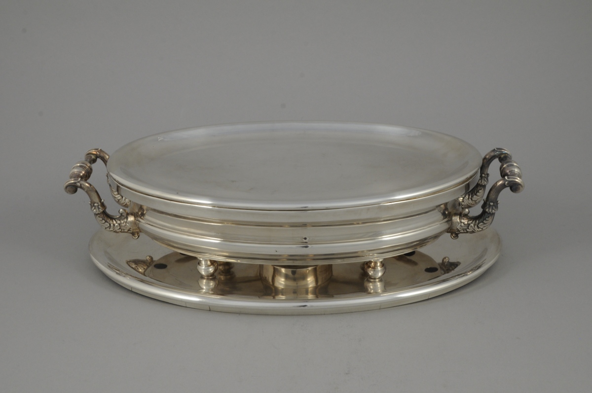 Un CHAUFFE-PLAT à bougies, en métal argenté, de forme ovale. Anses en volutes. Avec son plateau de présentation. XXème. Long. 43 cm.
