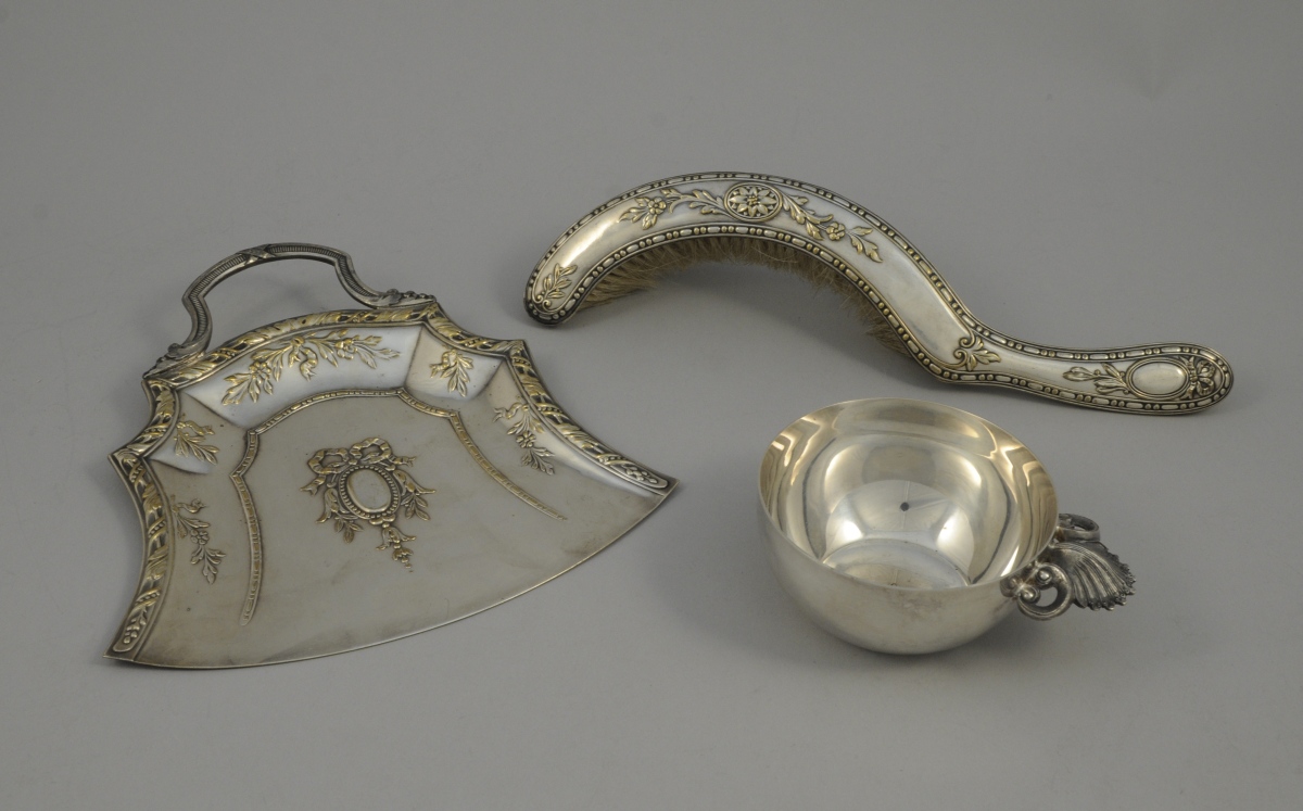 Un RAMASSE-MIETTES : balayette et plateau, décor dans le style Transition d'un médaillon sommé d'un ruban noué, rais de perle, feuilles d'acanthe stylisées, rameaux feuillagés et fleuris et rosace. Long. 33 et 24,5 cm.