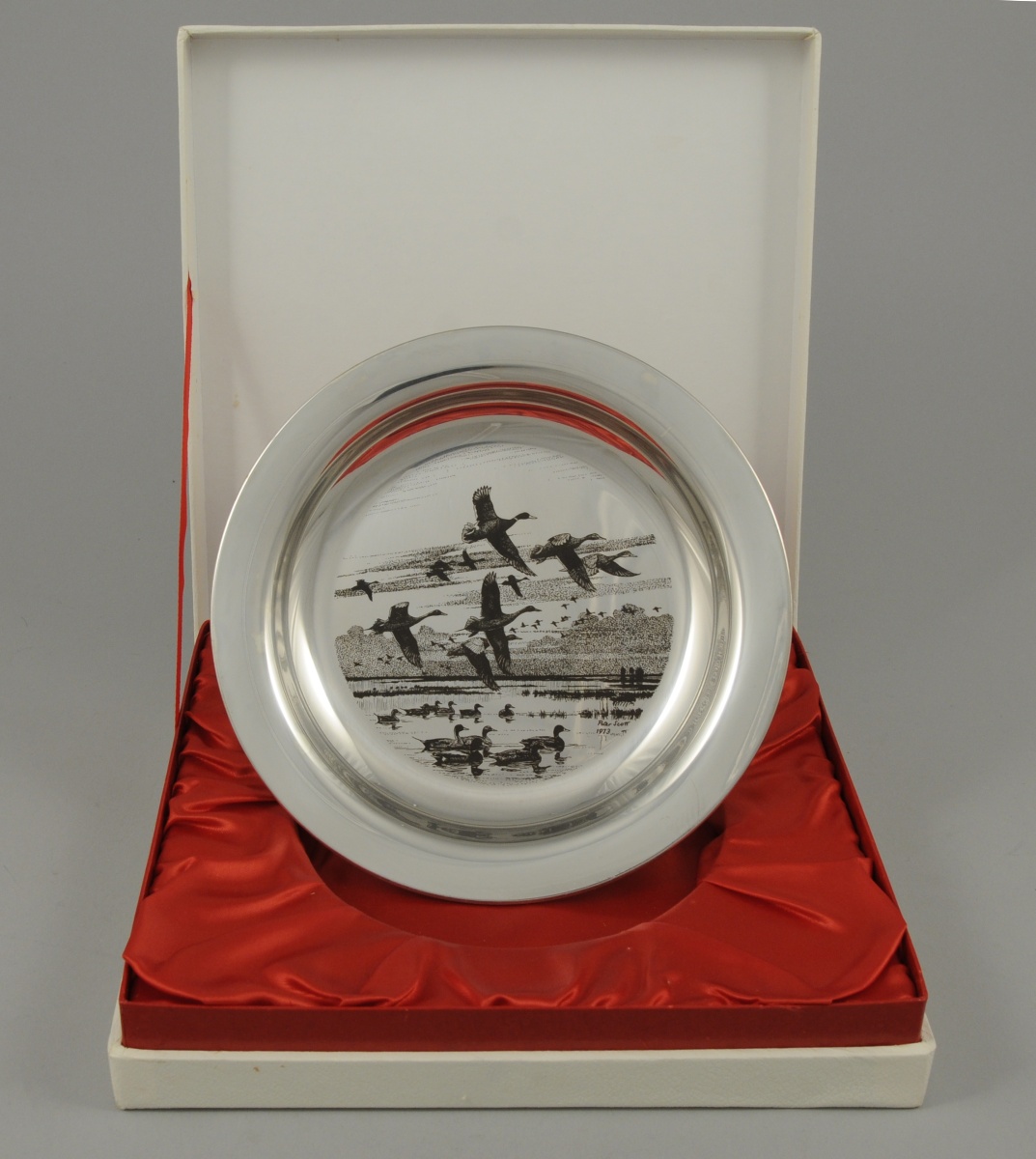 Peter SCOTT. ASSIETTE en argent dite "Christmas Plate" en métal argenté. Décor titré "Evening Flight" gravé et patiné dans le bassin et représentant des canards en vol et en eau dans un marais. Signée et datée 1973 en bas à droite. Poids. 185 g. Diam. 20,5 cm.