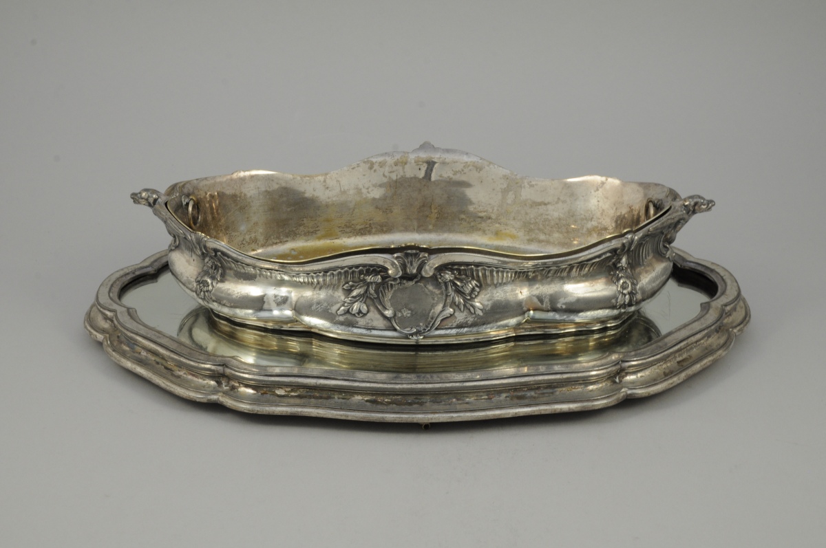 Réunion d'une JARDINIÈRE avec sa garniture intérieure et d'un SURTOUT de table en métal argenté. Le surtout de forme contournée, foncé d'une glace. La jardinière de forme contournée, aux extrémités ornées de chimères ailées, et décorée de motifs rocaille tels que médaillons, coquilles et chutes de fleurs.