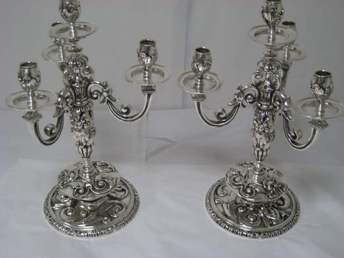 PAIRE DE CANDÉLABRES à quatre lumières en bronze argenté recevant un riche décor dans le goût de la Renaissance de masques de faunes, mascarons, atlantes, feuilles d'acanthes stylisées et volutes. Haut. 46 cm, Diam. du pied 21 cm.
