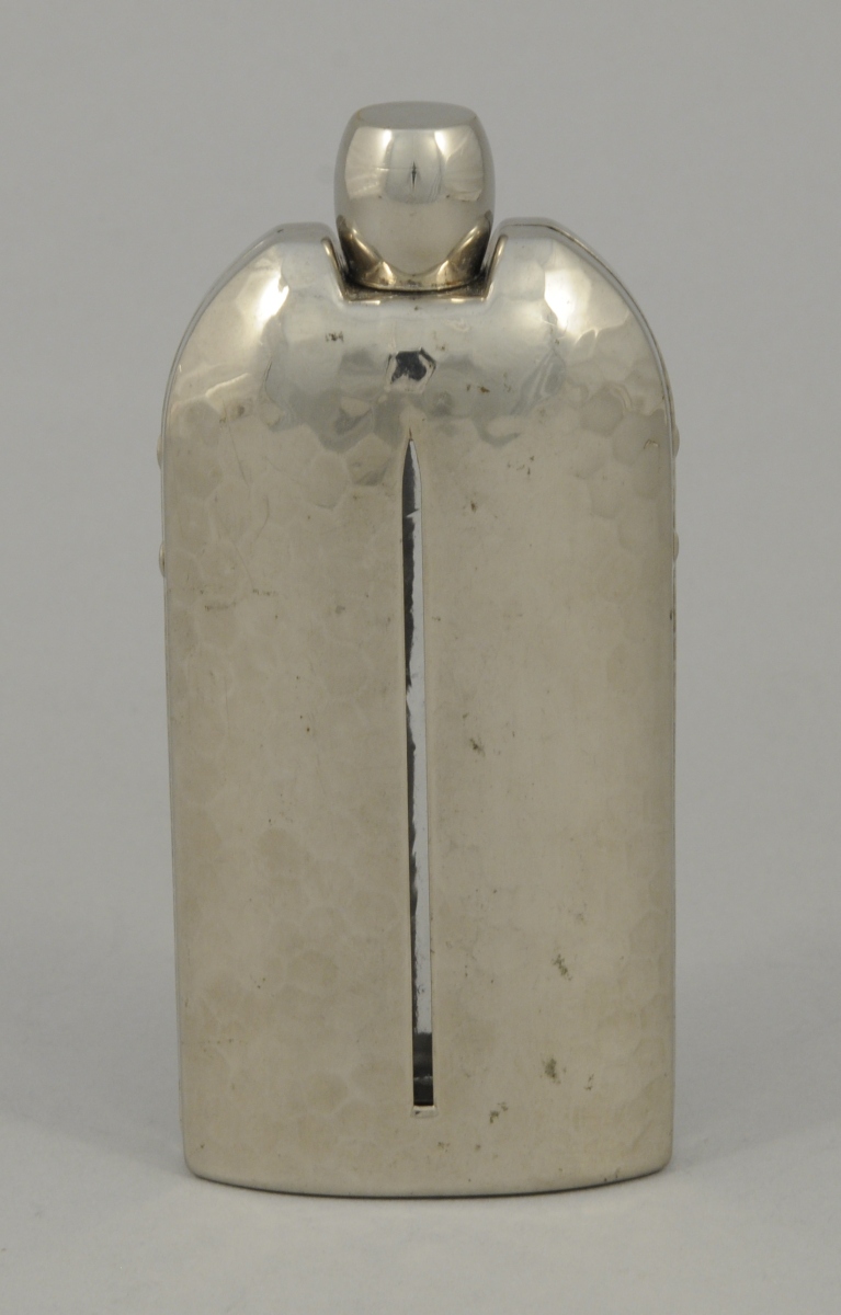 FLASQUE composée d'une bouteille en verre enserrée par deux coques en métal argenté martelé. Deux longues ouvertures permettent de contrôler le niveau du liquide contenu dans la bouteille. Milieu du XXème. Haut. 15 cm.