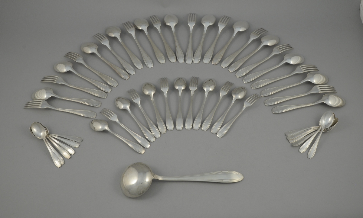 MÉNAGERE DE TABLE en métal argenté de 49 pièces : 12 couverts de table, 12 cuillères à café, 1 louche (usures)