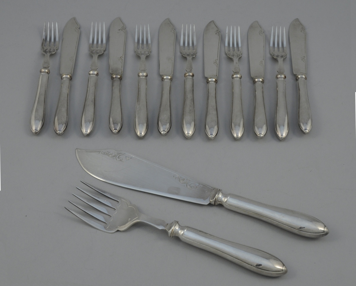 SIX COUVERTS à POISSON et un COUVERT de SERVICE à poisson en métal argenté. Lames et fourchons gravés d'un filet et de volutes. Angletterre, XXème. Long. couteau de service à poisson 28,5, couteaux 21,1 cm.