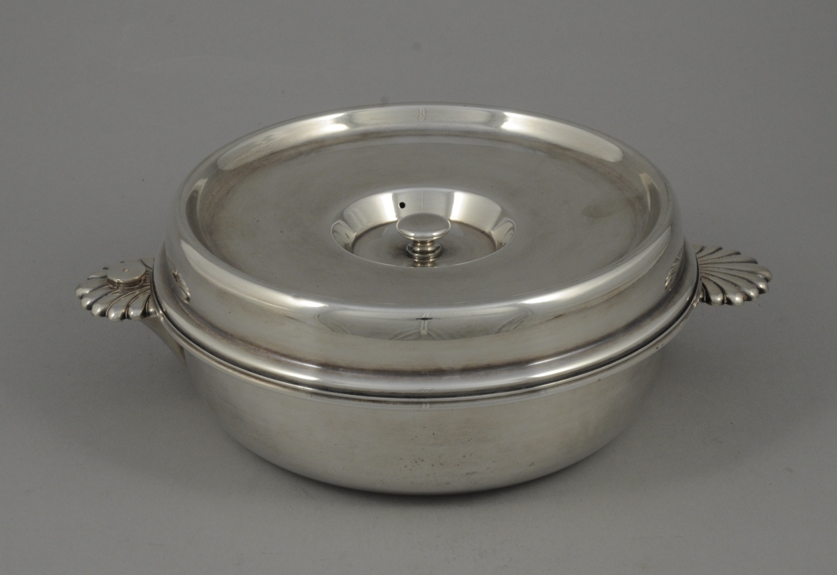CHAUFFE-PLAT à eau chaude en métal argenté, à trois compartiments intérieurs. Anses en forme de coquilles. Orfèvre : Deetjen. XXe. Haut. 10, Diam. 24 cm.