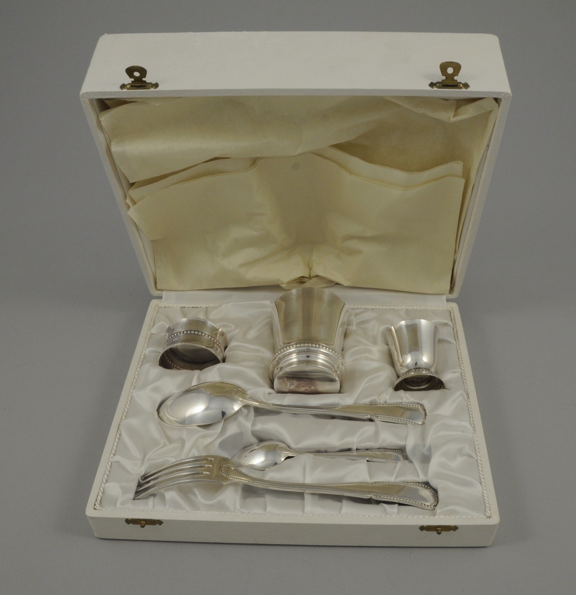 Un COFFRET de naissance, avec un couvert, une petite cuillère, deux timbales et un rond de serviette en métal argenté, à décor de rangs de perles. Dans son écrin.