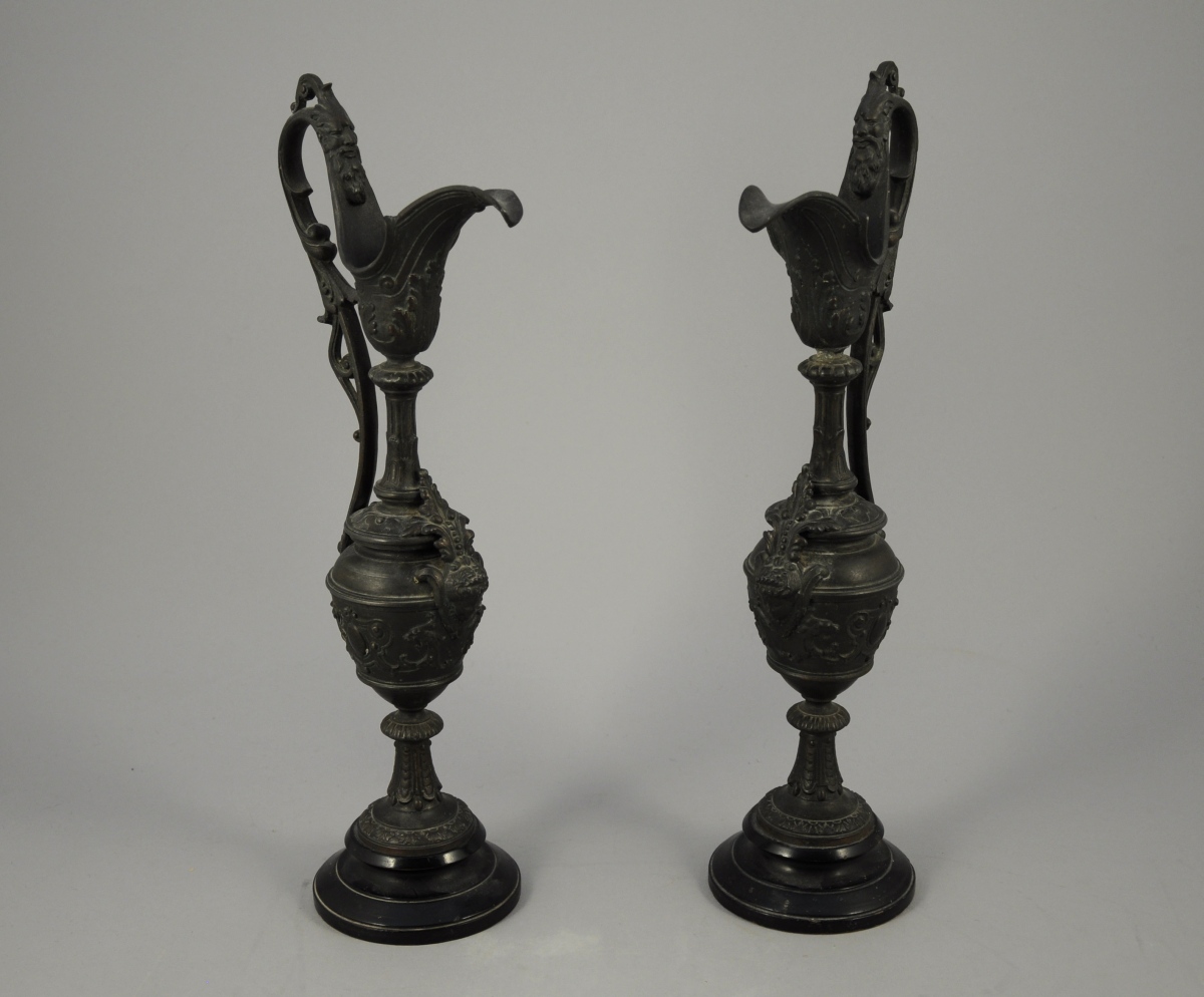 Paire de VASES d'ornement en forme d'aiguières en régule à patine sombre. Anses ornées d'un masque barbu. Sur la panse, masque féminin sous une palme. Décor de feuillages, têtes d'animaux grotesques et lambrequins.