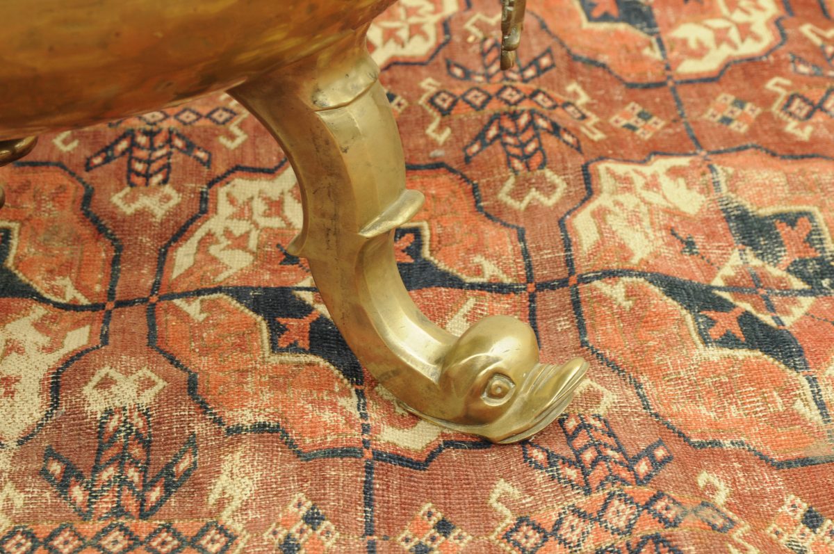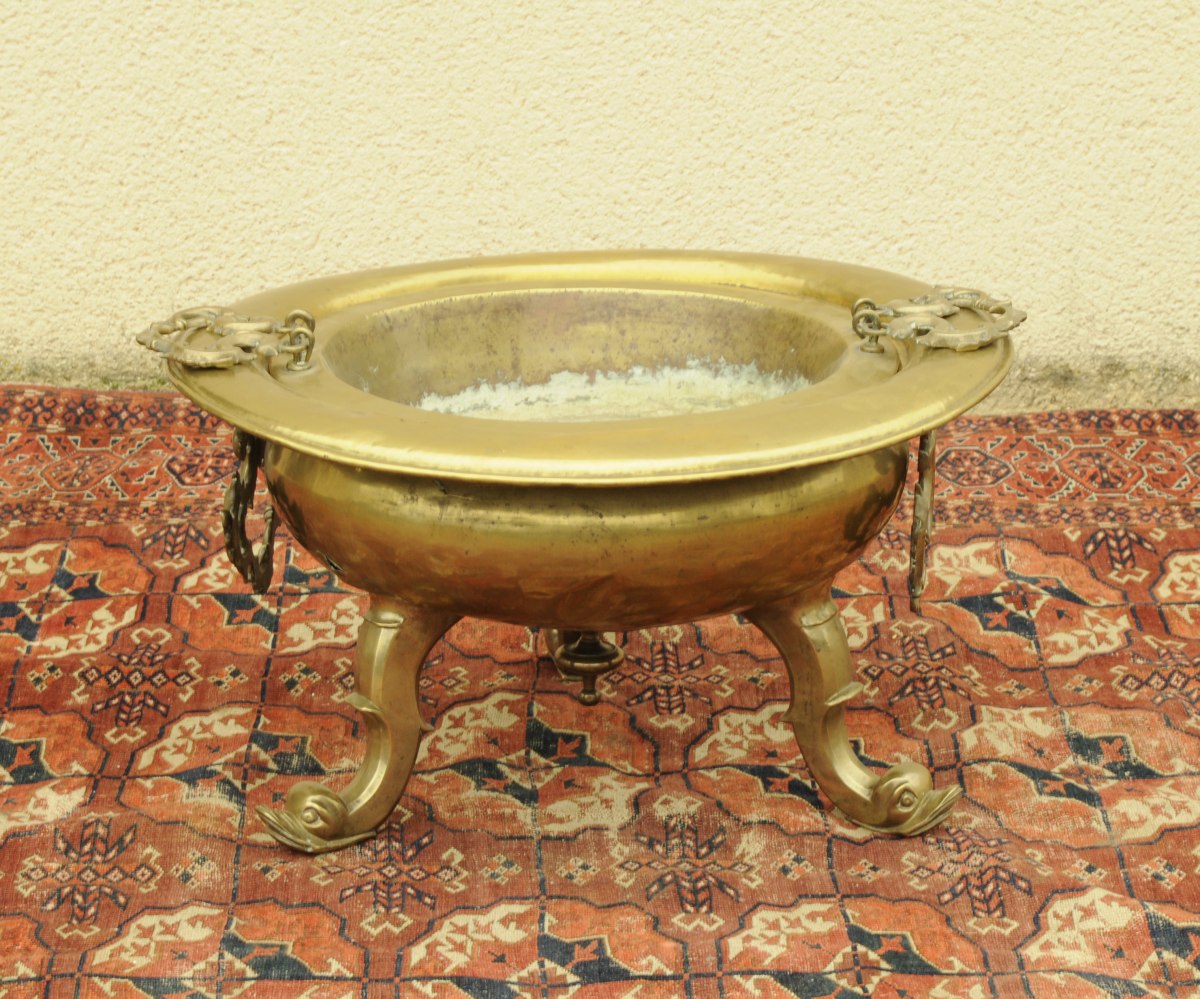 BRASERO de forme ronde en laiton présentant quatre anses ajourées ornées d'agrafes et de feuillages stylisés. Repose sur trois pieds cambrés terminés par une tête de dauphin. De la cuve pend une toupie. Travail ancien probablement espagnol.