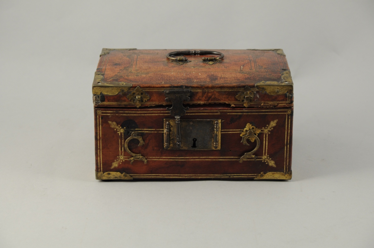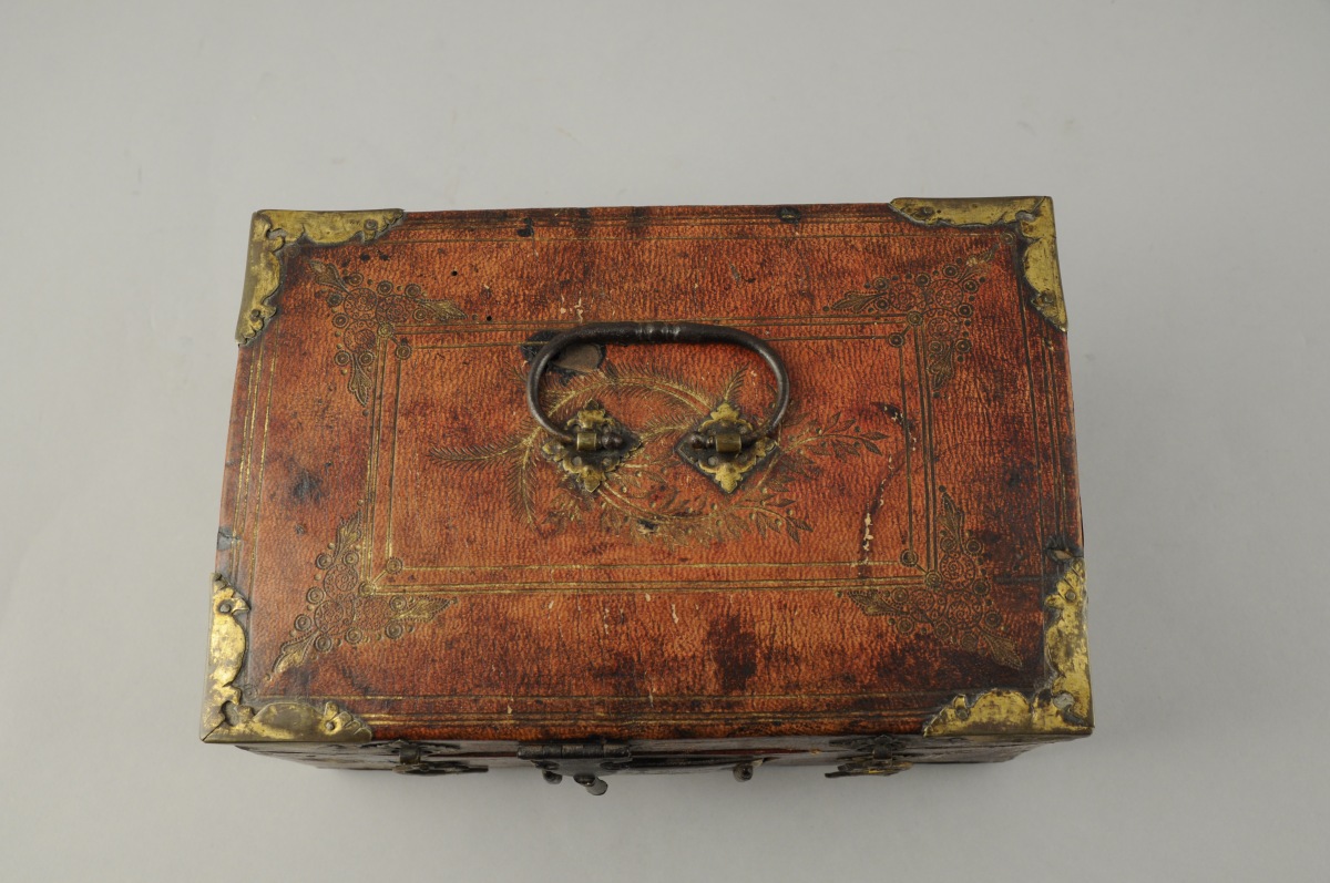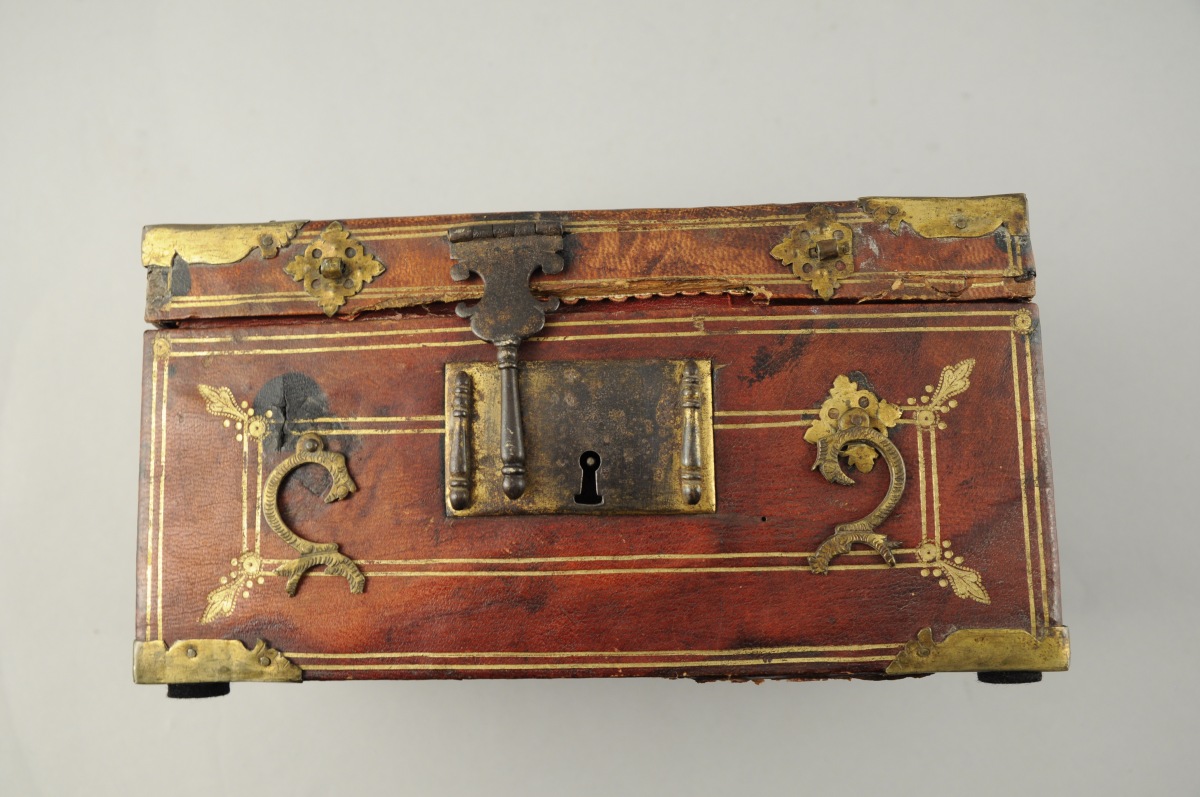 COFFRET DE VOYAGE, de forme rectangulaire, légèrement bombé. Âme de bois gainée de maroquin rouge doré aux petits fers d'un décor de volutes feuillagées, écoinçons et filets. Ferrures telles que crochets et serrure à moraillon en fer doré. Fin XVIIème, début XVIIIème. Haut. 13,6, Larg. 24,2, Prof. 16 cm. (usures, accidents et manques).