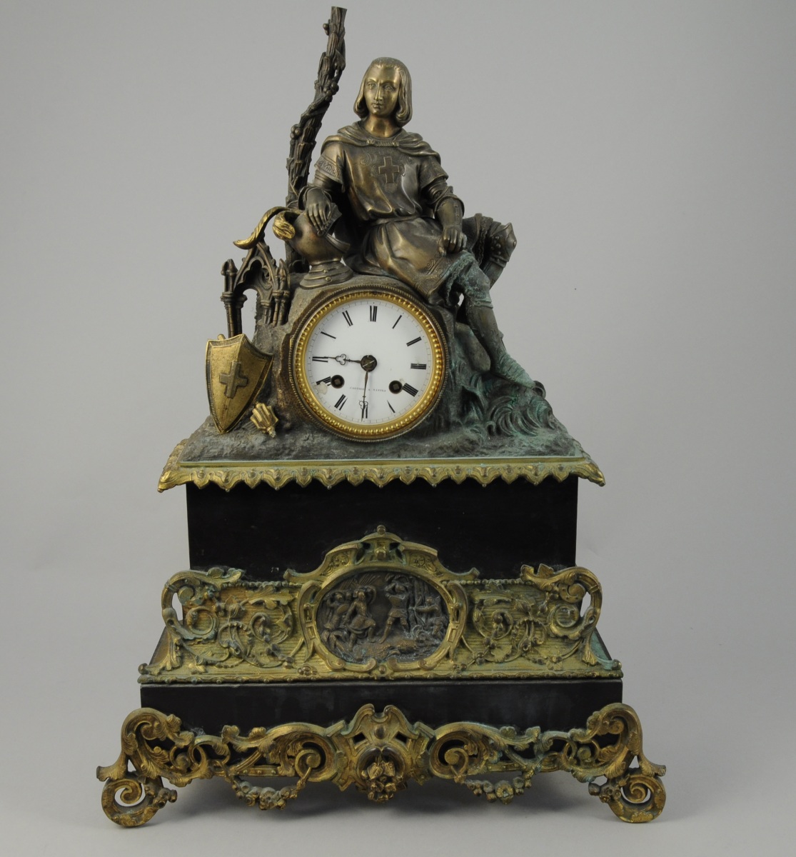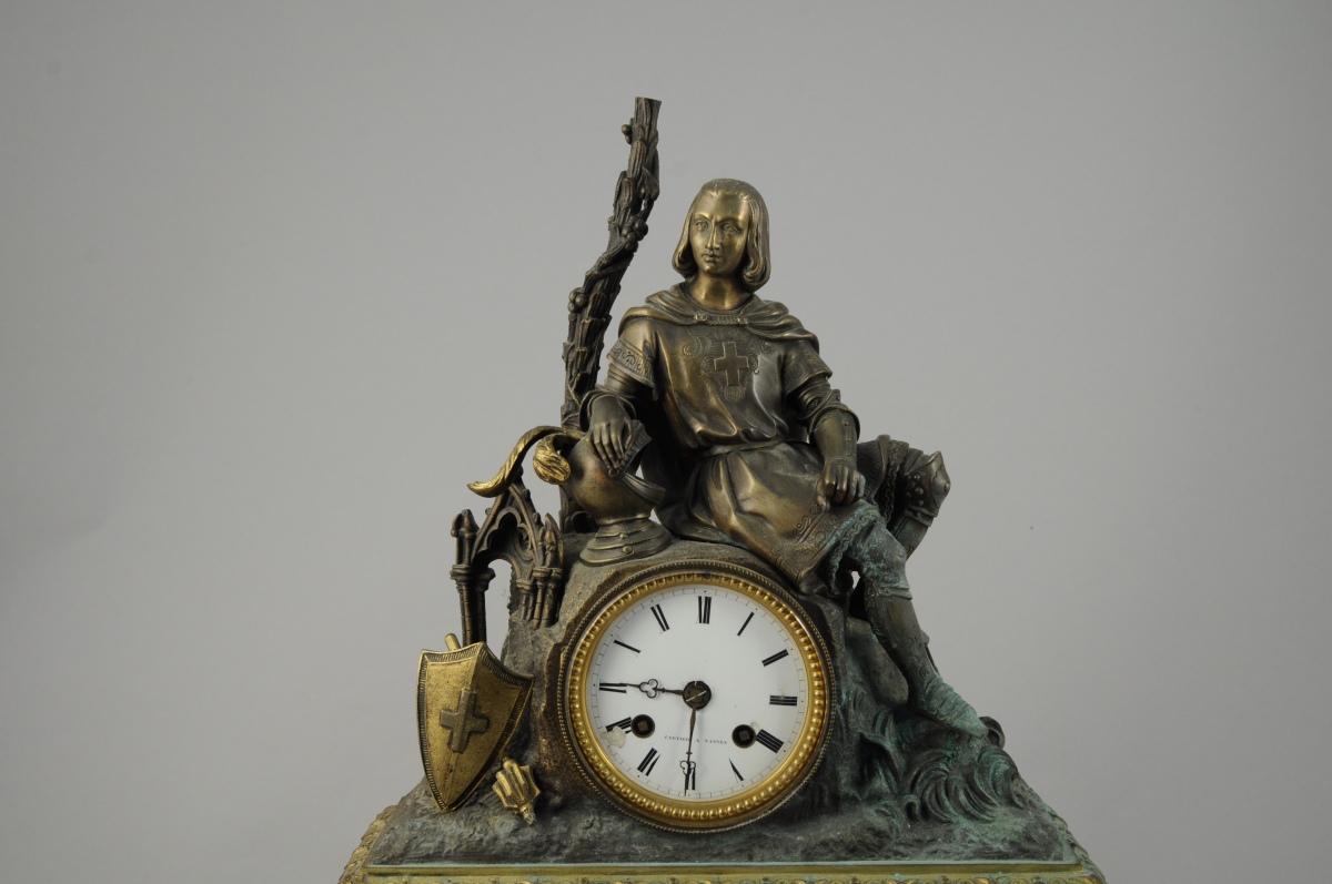 PENDULE au Templier, en bronze de deux tons sur marbre noir. Riche ornementation de rinceaux, entrelacs, feuilles d'acanthe, volutes et guirlandes de fleurs. Une scène de bataille au centre. Mouvement signé "CARTIER A NANTES". XIXème. Haut. 53, Larg. 37, Prof. 13 cm. (accidents et oxydations)