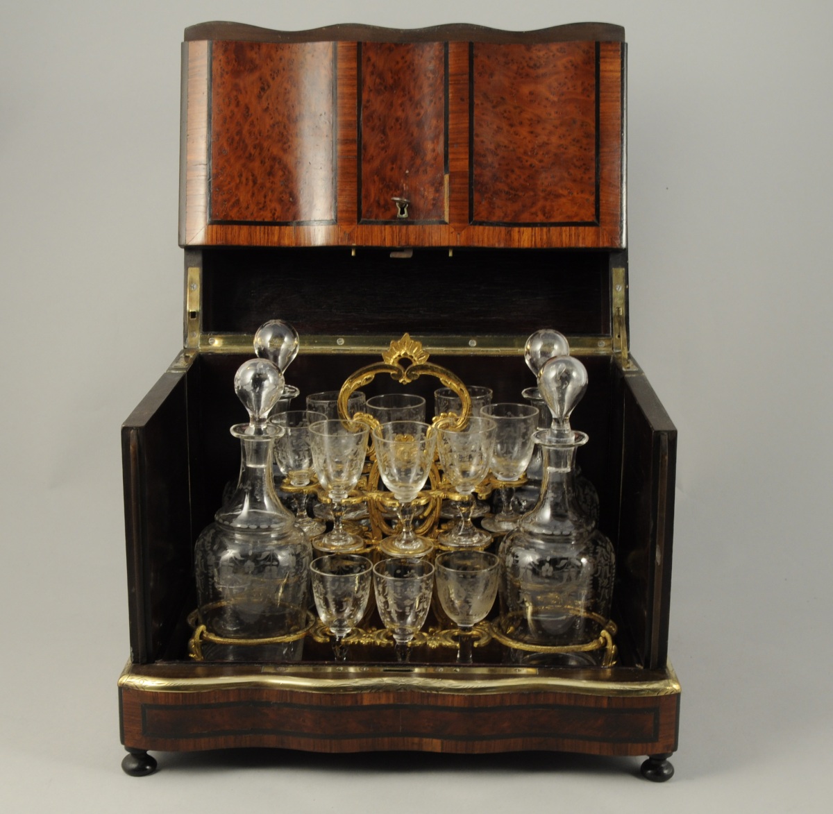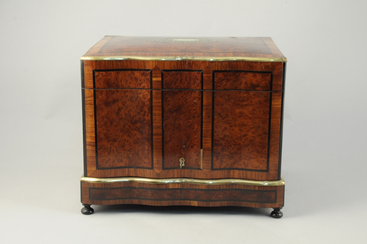 CAVE à LIQUEUR en placage de thuya, filets de bois sombre et laiton gravé de motifs floraux. La caisse présente une façade mouvementée à double articulation. Elle repose sur quatre pieds en sphère aplatie. Décor d'un double cartouche à bords mouvementés et guirlandes de fleurs en marqueterie dite Boulle, de laiton gravé, palissandre et nacre. Couvercle légèrement bombé. Côtés montés à charnières. L'intérieur découvre un service en cristal (incomplet) comprenant : quatre carafes et quatorze verres à pied gravés d'une frise florale et de pois, sur une monture en bronze doré à deux niveaux. Napoléon III. Haut. 27,4, Larg. 32,4, Prof. 24,3 cm. (manques et soulèvements au placage)