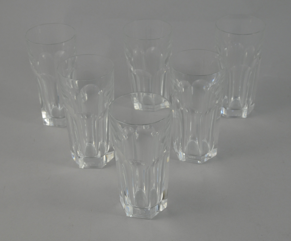 Six CHOPES GOBELETS HARCOURT de forme hexagonale en cristal de Baccarat. XXème. Boite. Haut. 14 cm.