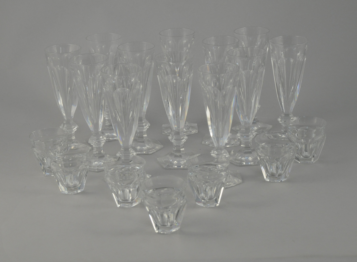 BACCARAT, modèle HARCOURT. Partie de SERVICE en cristal, comprenant 12 flûtes et 7 verres à liqueur. (aucun accident)