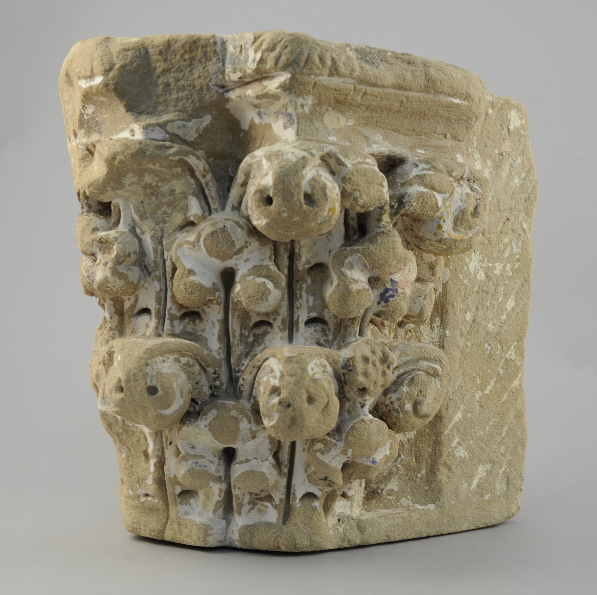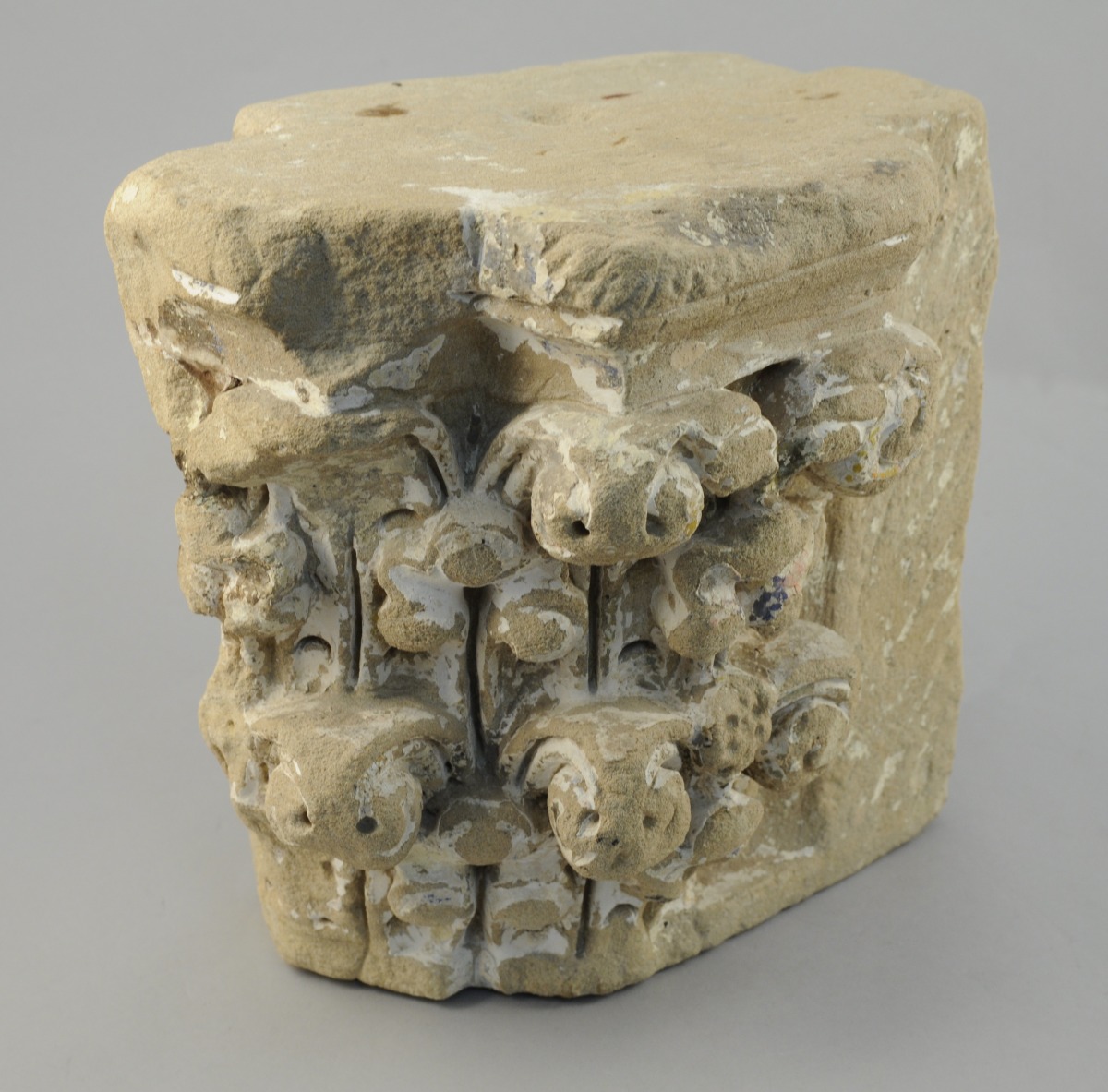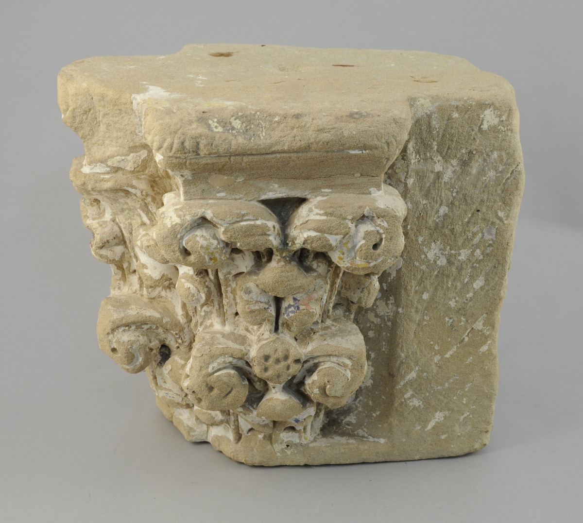 CHAPITEAU D'ANGLE en pierre calcaire sculptée en fort relief de feuilles recourbées. Travail ancien. Traces de polychromie. Haut. 30,5, Larg. 33,5, Prof. 22 cm.