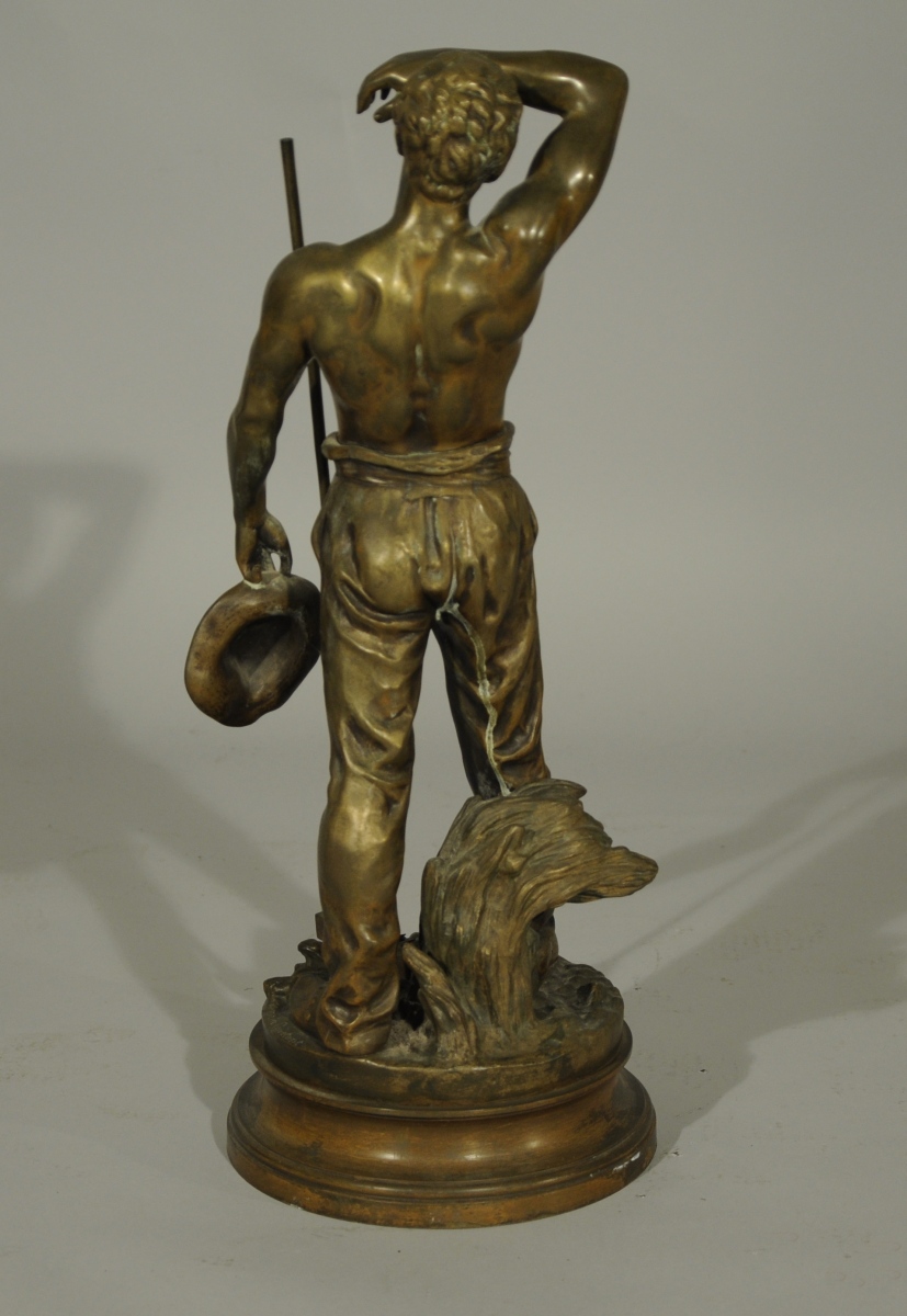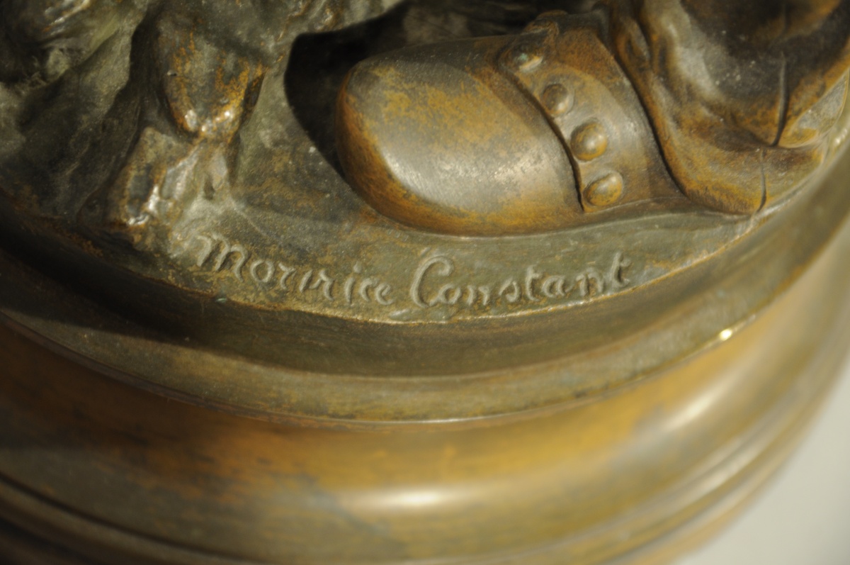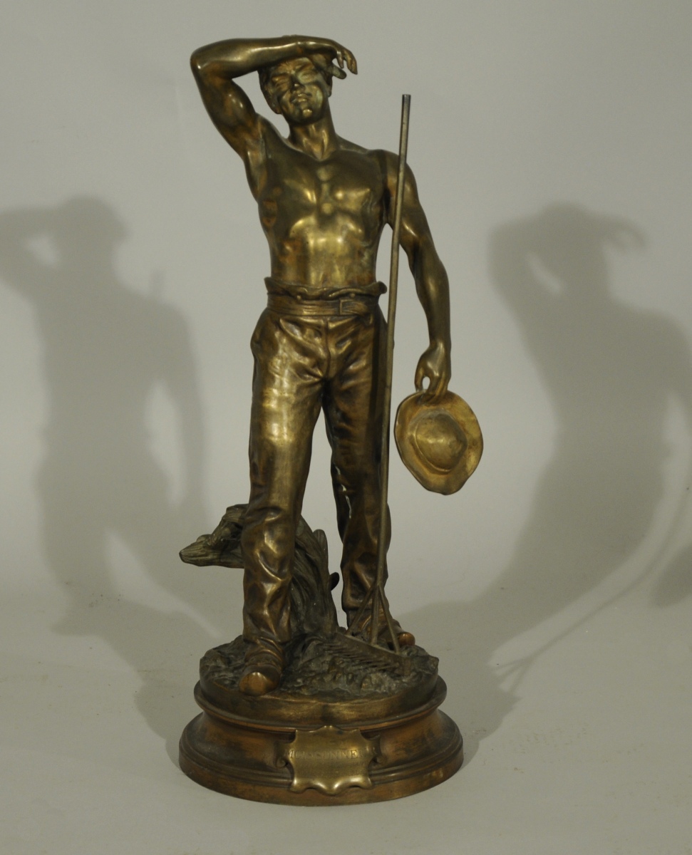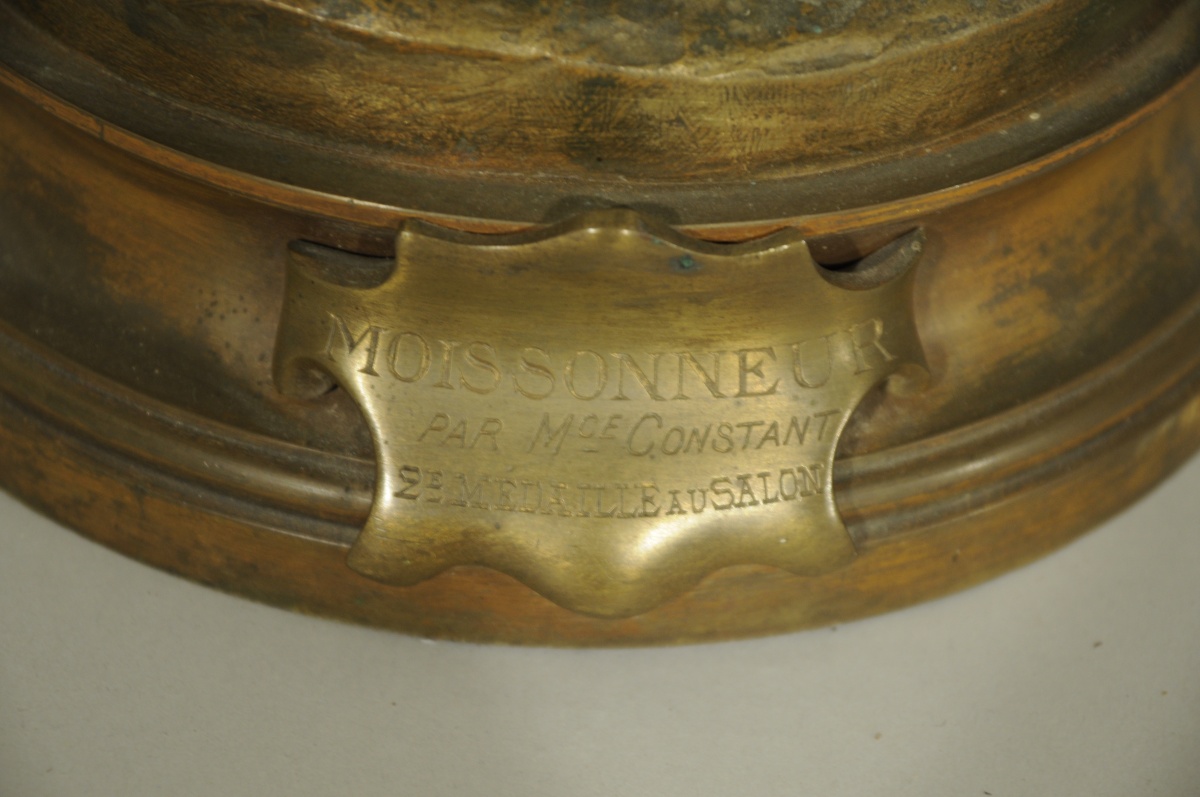 Bronze à pâtine dorée et cuivrée, signé sur la terrasse, sur un socle en bronze cuivré orné d'un cartel en bronze "MOISSONNEUR PAR MCE CONSTATN 2E MEDAILLE AU SALON". Hauteur totale : 59,5, Diam. de la base 28 cm.