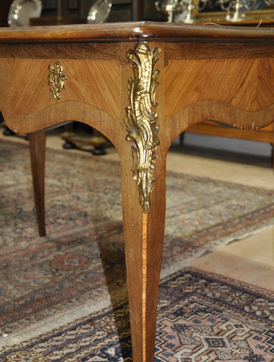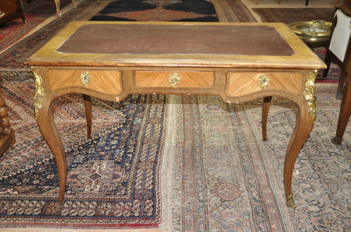 BUREAU plat en placage de bois de rose sur fond de bois de violette. Il ouvre par trois tiroirs en ceinture, l'autre façade à tiroirs simulés. Ceinture chantournée, pieds cambrés. Garniture de bronzes dorés rocailles, telles qu'entrées de serrures, chutes d'angles et sabots.