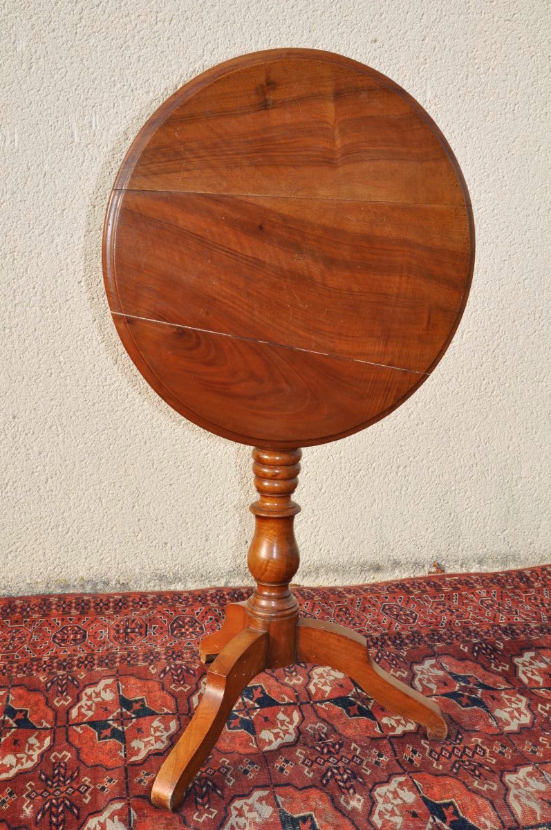 GUÉRIDON en noyer, piètement tripode, fût cannelé, plateau circulaire basculant.