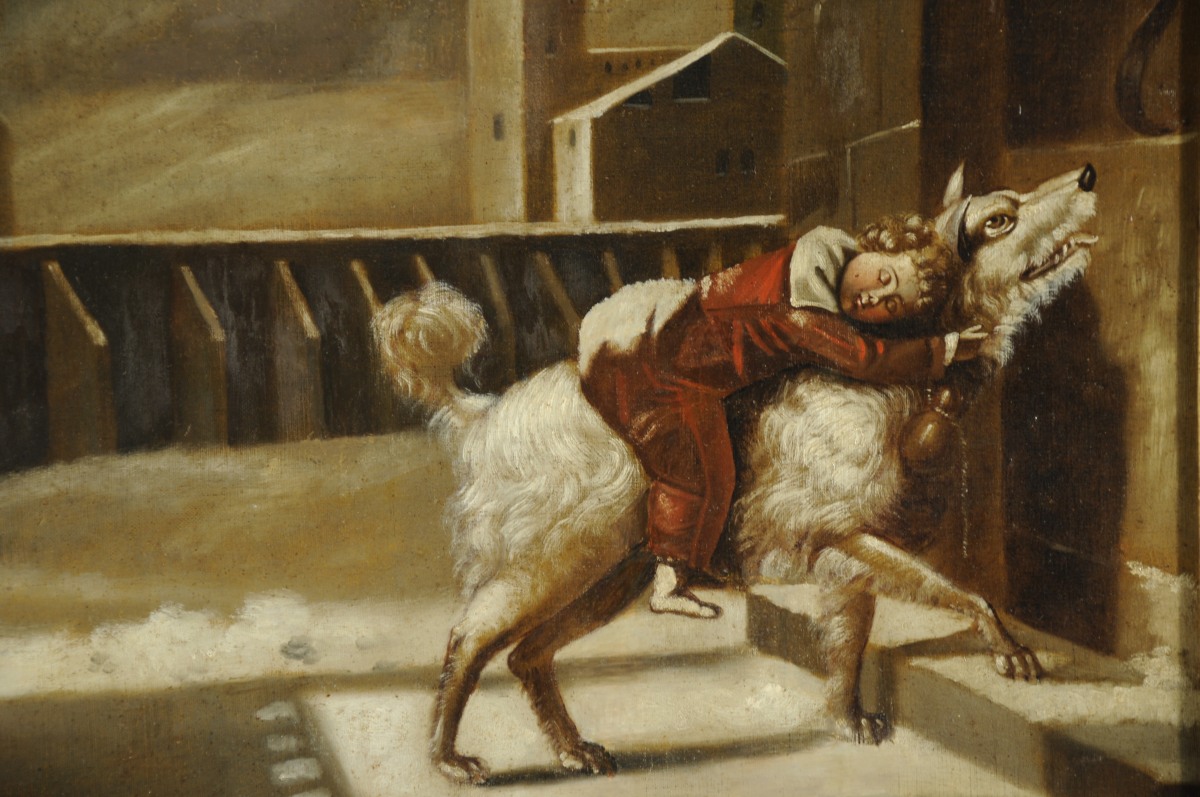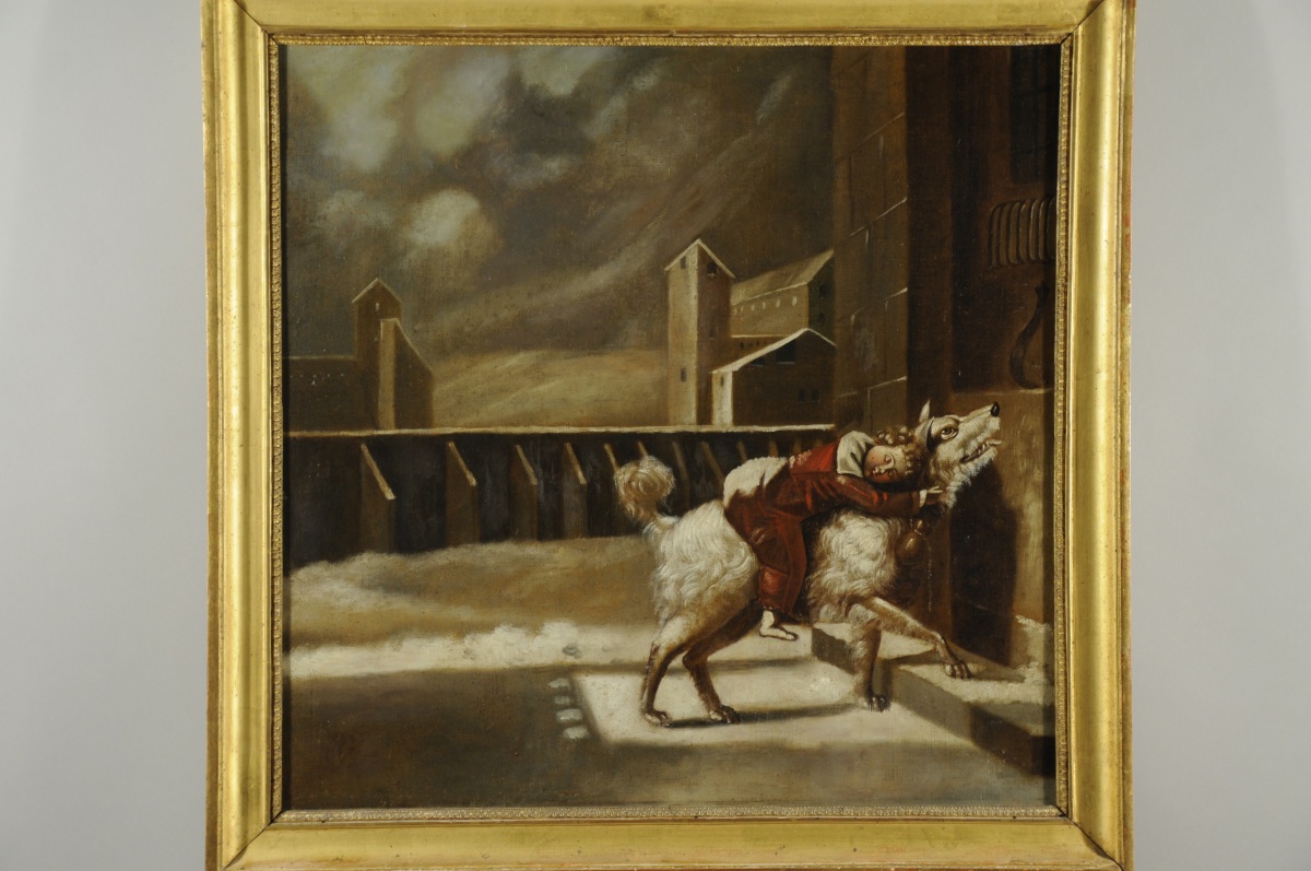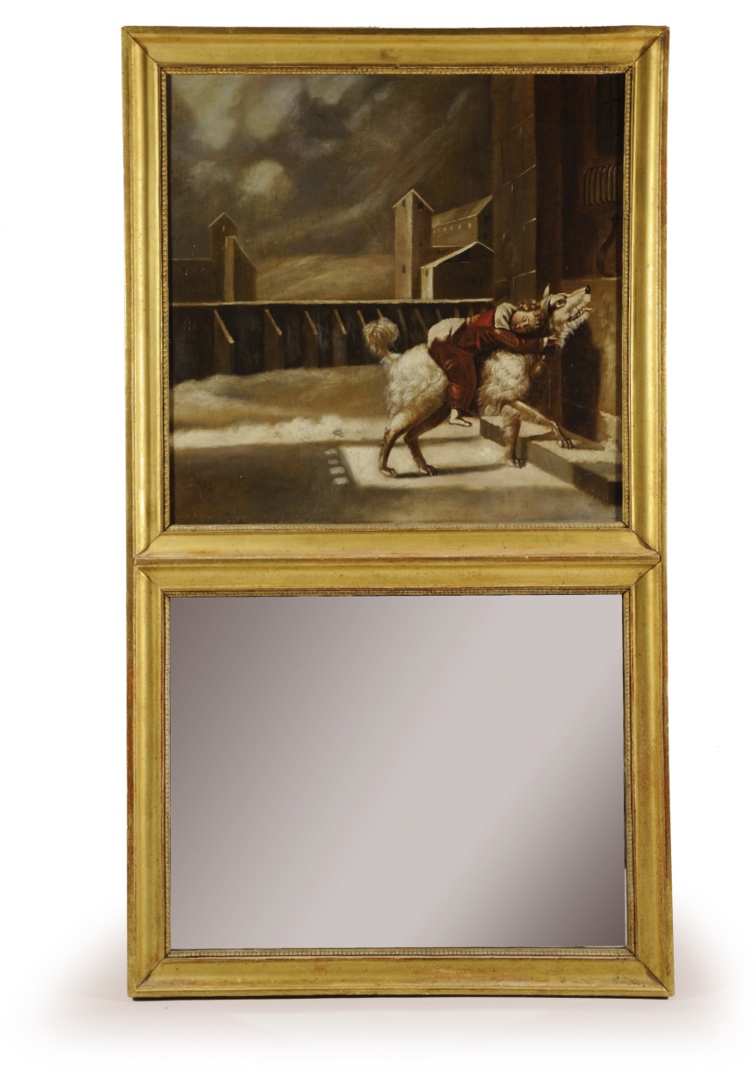 TRUMEAU en bois mouluré et doré. Partie inférieure foncée d'un miroir, à bordure de rais de cur. Partie supérieure ornée d'une huile sur toile figurant "Le Chien de l'Hospice", d'après la composition de Pierre Antoine Vafflard (Paris, 1779-1838), diffusée par l'eau-forte de Dibart dès 1810.