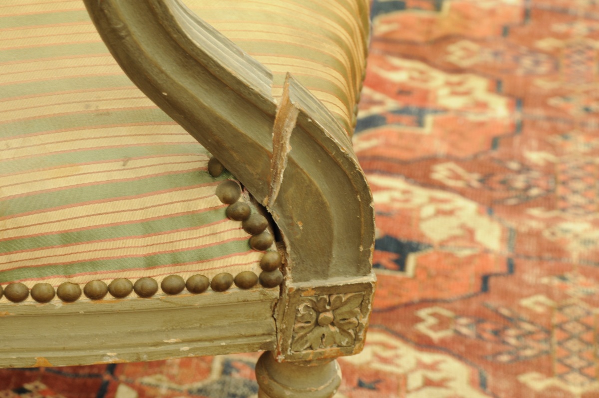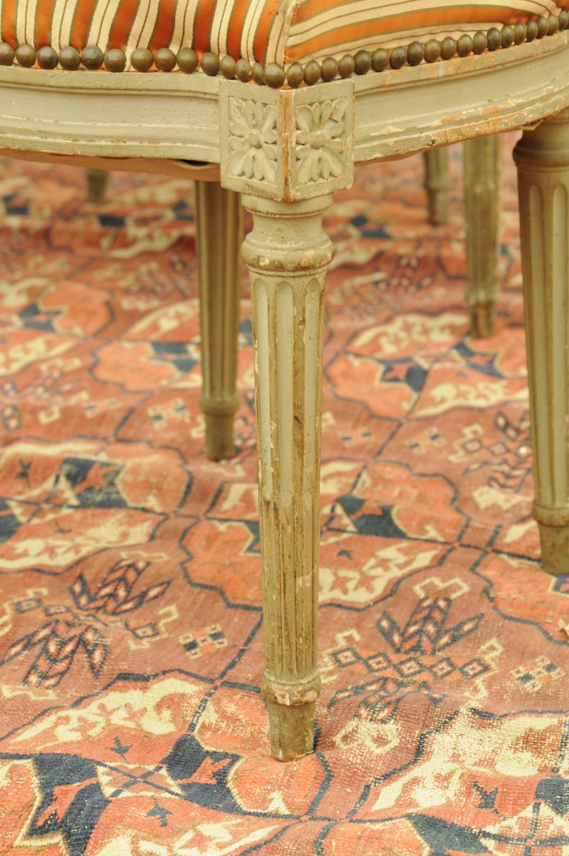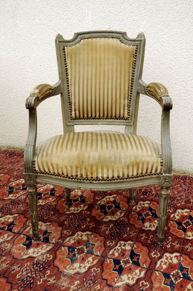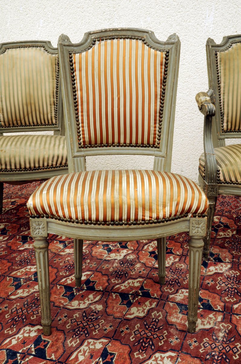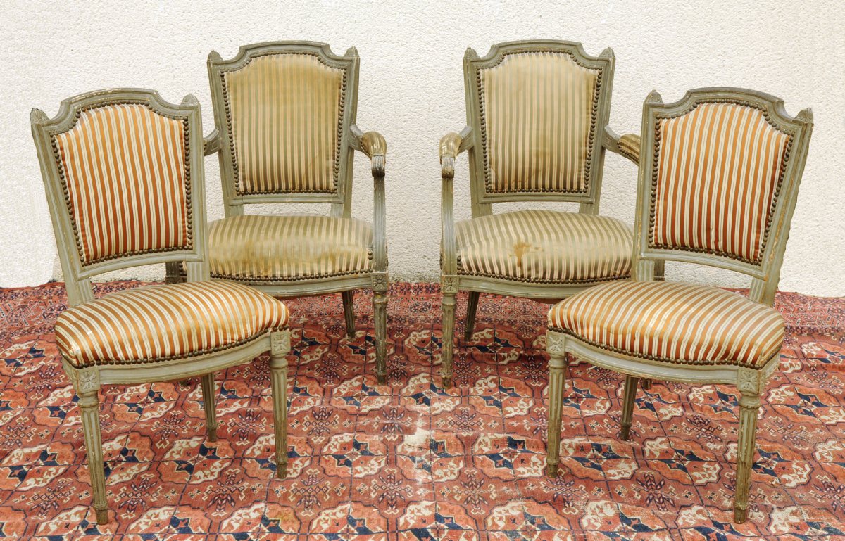 SALON QUATRE PIECES, comprenant deux chaises et deux fauteuils - modèle cabriolet à chapeau de gendarme - en bois laqués gris perle, mouluré et sculpté de feuilles d'acanthe, cannelures, dés de raccordement et cannelures rudentées. Travail ancien de style Louis XVI. Haut. 87, Larg. 50, Prof. 43 et Haut. 86, Larg. 80, Prof. 50 cm. (usures et petits accidents)