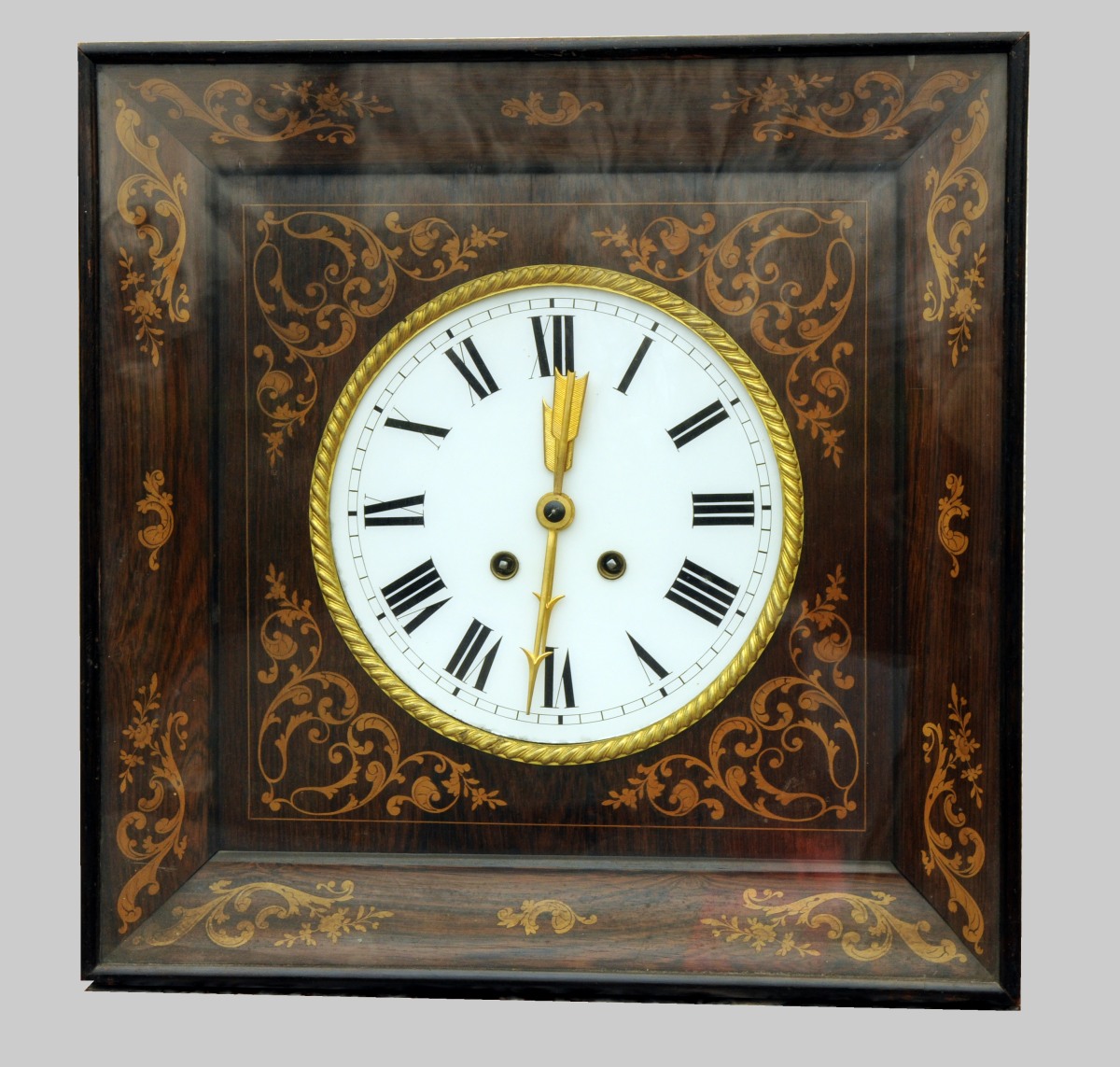 PENDULE à suspendre de forme carrée en bois mouluré plaqué de palissandre et marqueterie de bois clair tels que écoinçons, agrafes, volutes, branches feuillagées et fleuries et filets. Cadrant en verre peint à douze chiffres romains cerclé d'une frise de godrons rayonnants en bronze ciselé et doré. Aiguilles adoptant la forme d'une flêche en bronze ciselé et doré. Charles X. Dim. 47 x 47, Prof. 12,3 cm.