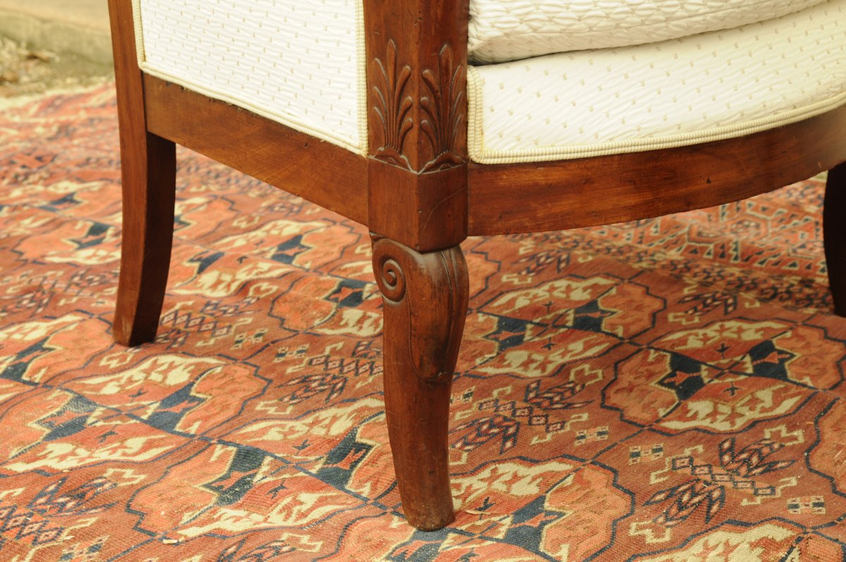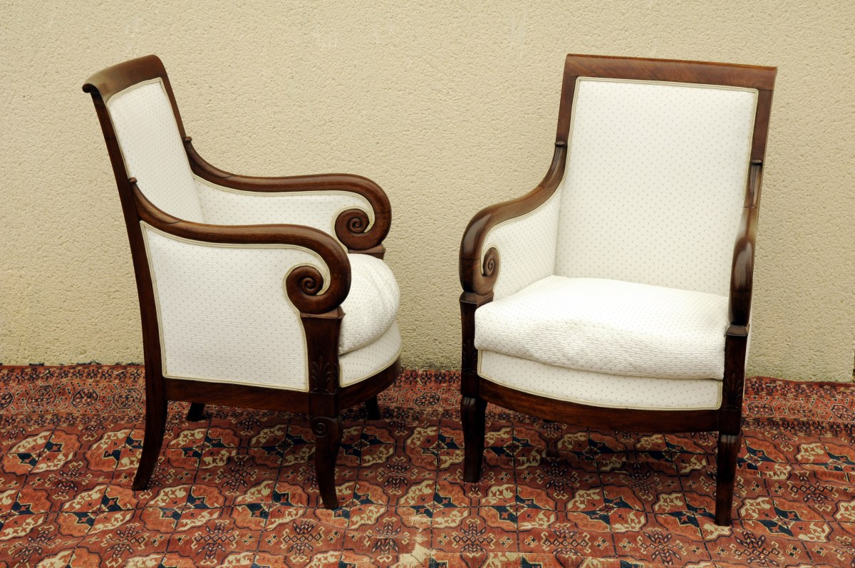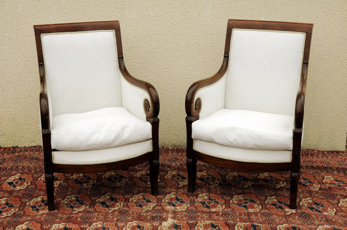 PAIRE de BERGÈRES en acajou et placage d'acajou. Accotoirs se terminant en crosse. Pieds antérieurs en cuisse de grenouille sculptés de palmettes, pieds postérieurs en sabre. Restauration. Haut. 93,5, Larg. 62, Prof. 50,5 cm.